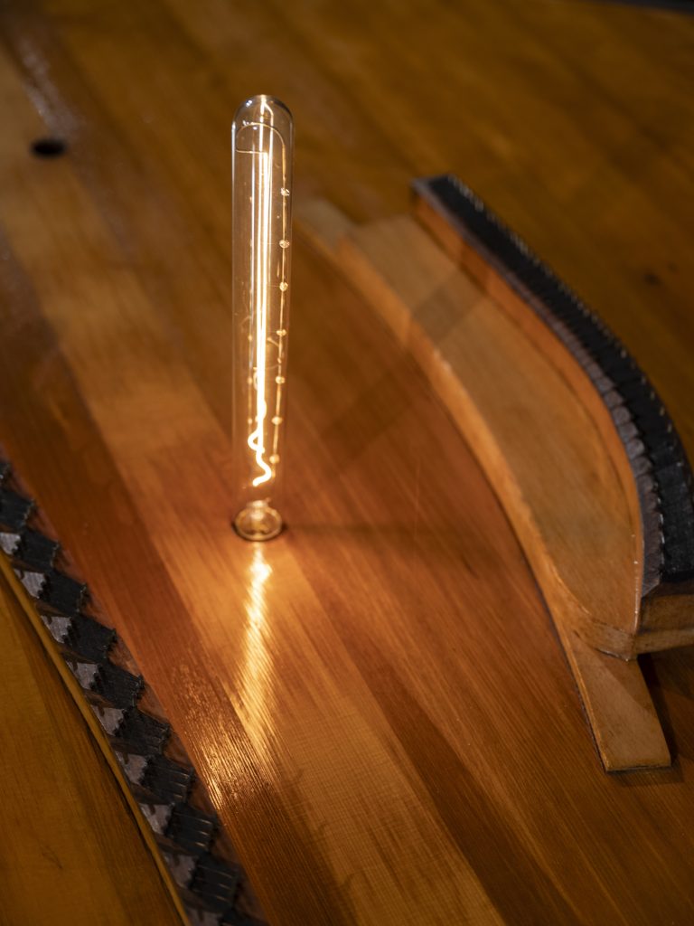 Come i notai parlavano una lingua non comprensibile ai più – il latino – nella segretezza della cappella, così due lampadine di Edison si parlano oggi, poggiate su una tavola armonica (soundboard) che, paradossalmente, non amplifica più suoni, ma luce. Le due lampadine comunicano tra loro con un linguaggio misterioso e arcaico: quello della luce, dei segnali incandescenti di fuoco, usati da millenni per trasmettere messaggi sulle lunghe distanze. Segnali luminosi che hanno sempre superato confini – borders, appunto – per raggiungere terre lontane, avvertire di un pericolo, annunciare una tregua, o scandire l’ora dei riti sacri. Così le due lampade, come fari nell’ombra intima della Cappella dei Notai, si parlano lungo i margini della tavola armonica, dove un tempo poggiavano vibranti le corde di un pianoforte verticale. I ponti, oggi posati in orizzontale, sembrano delineare un nuovo paesaggio geografico, «una partitura visiva», racconta Mazzonelli, dove la tavola armonica, come in un modello architettonico in scala, funge da suolo; le lampadine diventano punti notevoli, e i ponti sono solchi nel terreno. Le onde di luce producono un ritmo da ascoltare con gli occhi, da immaginare con la mente. Le interruzioni, le pause e le accensioni, a volte brevi, a volte più lunghe, fanno intuire uno scambio indecifrabile ma tangibile.