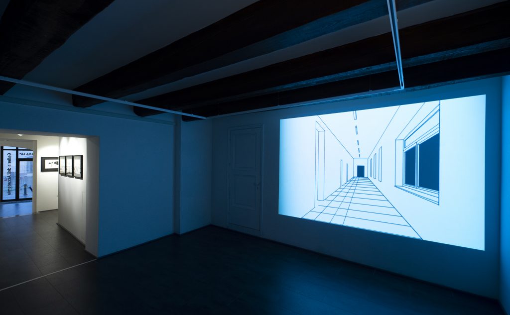 Una particolare illuminazione, infine, unita alla riproduzione continua di un file sonoro, attira lo spettatore verso l’ultima sala espositiva, quasi interamente occupata (fatta eccezione per LW., unica rappresentazione antropomorfa presente) da Less than five minutes: un’animazione video del 2009 che crea cortocircuiti visivi e, insistendo sullo sfondamento e sul ribaltamento dello spazio, disorienta volutamente lo sguardo.