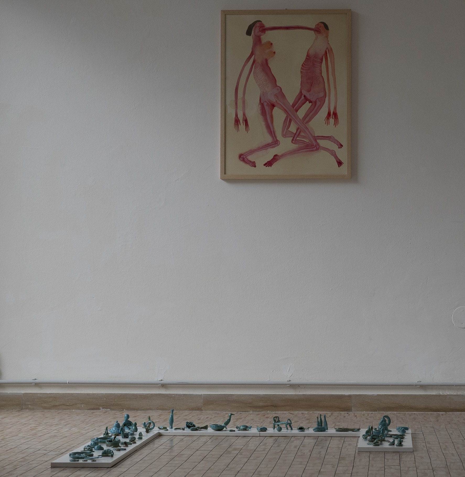 Lo sa bene Giulia Seri, che sembra vivisezionare i soggetti dei suoi acquerelli: interazioni e stati emotivi vengono rivelati anche dall’interno dei loro corpi, nell’aggrovigliarsi di ossa, organi, tessuti e vasi sanguigni, in un esercizio visivo continuo tra il dentro e il fuori. Estratti e isolati, ritroviamo dei frammenti anatomici anche ai nostri piedi, nell’opera Amuleto: come in un piccolo corredo funerario di ceramica smaltata, occhi, mani e orecchie sono oggetti tra i tanti, disposti insieme a monili di ogni genere.