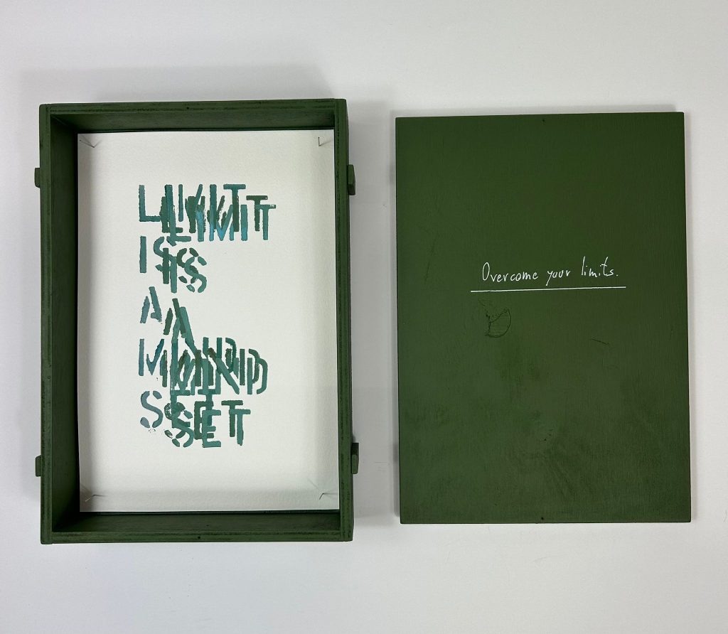 Nell’opera di Paolo Ceribelli invece, A LIMIT IS A MINDSET, superare il limite (anche quello che definisce l’interno e l’esterno, per esempio) è dovere di tutti. L’opera, tratta da un nuovo ciclo in cui scompare il soldatino di plastica per lasciare posto a una ripetizione grafica che diventa modulo stilistico, è al contempo incoraggiamento e inganno. Il motto ripetuto, a limit is a mindset, sembra un invito costante a superare i limiti, a credere che tutto sia possibile, eppure, ripetendosi, ci pone di fronte a un’ironica verità: siamo noi stesso il limite. Inner Space non ci mostra soltanto delle opere, ci fa riflettere su qualcosa di urgente: quale è la nostra posizione?