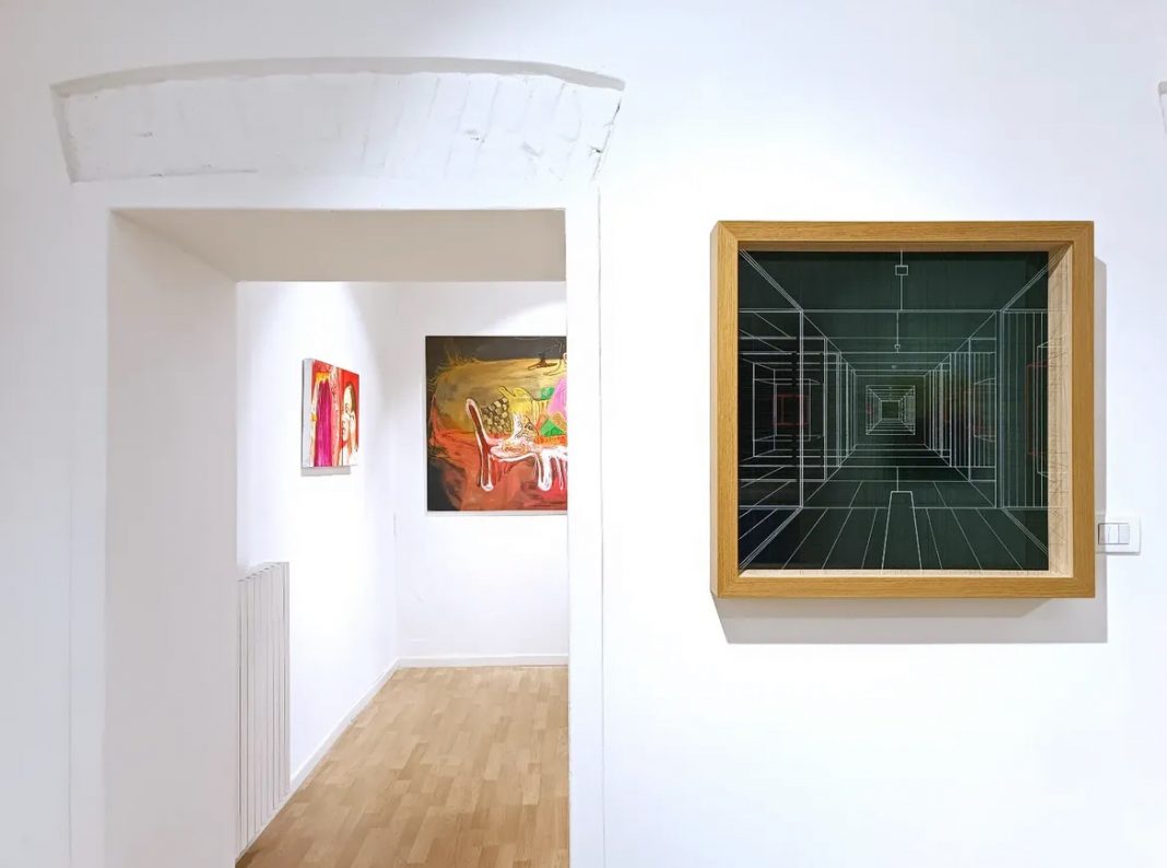 Ognuno di loro, attraverso un’opera, offre una rappresentazione personale, così per esempio, Casali crea opere che interrogano il confine tra il visibile e l’invisibile, il tangibile e l’immateriale. Questa ricerca riflette la sua visione della pittura come un tentativo continuo di dare forma all’invisibile, una resistenza al tempo e alla dissoluzione, un modo per esplorare ciò che persiste nella frizione e nel cambiamento, mentre Mazzone – che rinomina la sua ricerca Geometria Emotiva – dà forma a un percorso di misurazione empirica degli stati emotivi, un metodo per indagare la spiritualità e la consapevolezza mistica con un approccio scientifico, esplorando temi esistenziali come la questione dell’identità e il rapporto tra sé e il mondo.