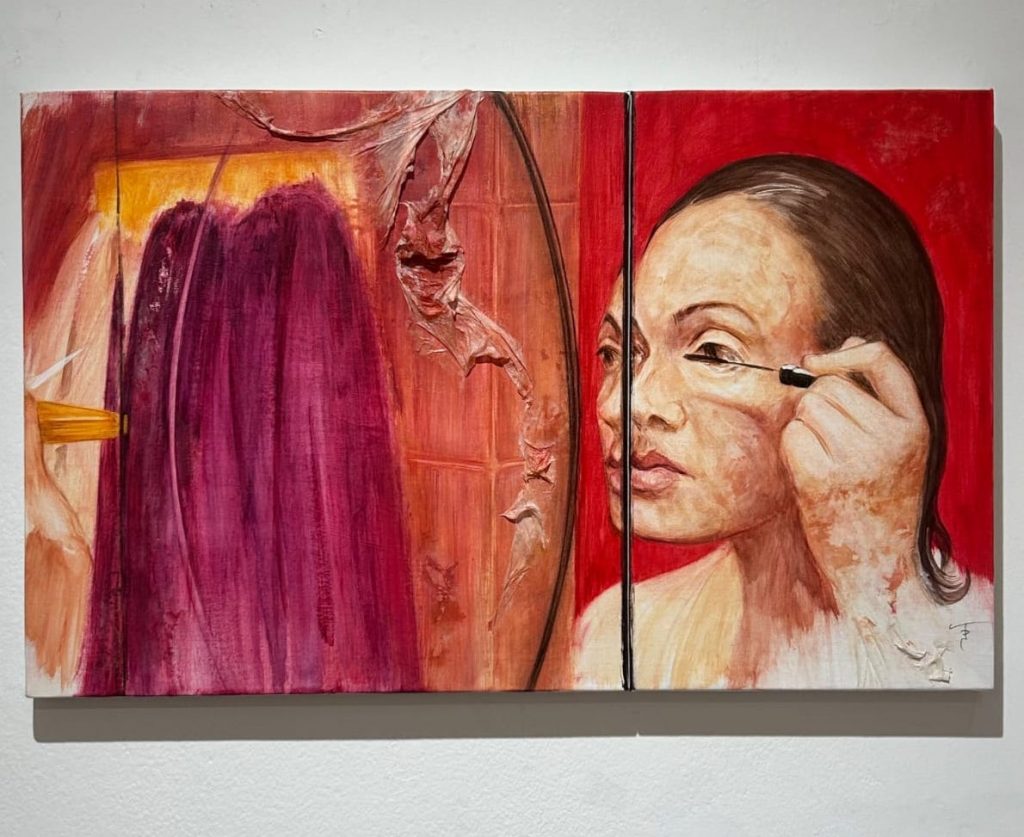 Tra chi propone una rappresentazione in termini più fisico-spaziali e chi invece più intimi, Jacopo Dimastrogiovanni propende per la dimensione psicologica. La sua opera, della serie Mirror – avviata nel periodo pandemico, che prosegue come trasfigurazione di fotogrammi di film in cui l’artista si rivede – è tratta dal film Gli amori impossibili del regista Guy Casaril. «Il fotogramma di quest’opera è molto intimo, è un momento di amara riflessione personale della protagonista femminile, colta nel momento in cui si trucca allo specchio. A colpirmi era la linea di giunzione tra le lastre dello specchio, che va a creare una frammentazione nel volto della figura. Ho voluto restituire fisicamente questa frammentazione lavorando su due tele distinte e facendo in modo che, avvicinandole, la figura non coincidesse, per richiamare la profonda spaccatura nell’essere del personaggio che in quel momento è diviso tra la realtà della sua esistenza e delle cose materiali e le sue aspirazioni e illusioni mancate dall’altro».