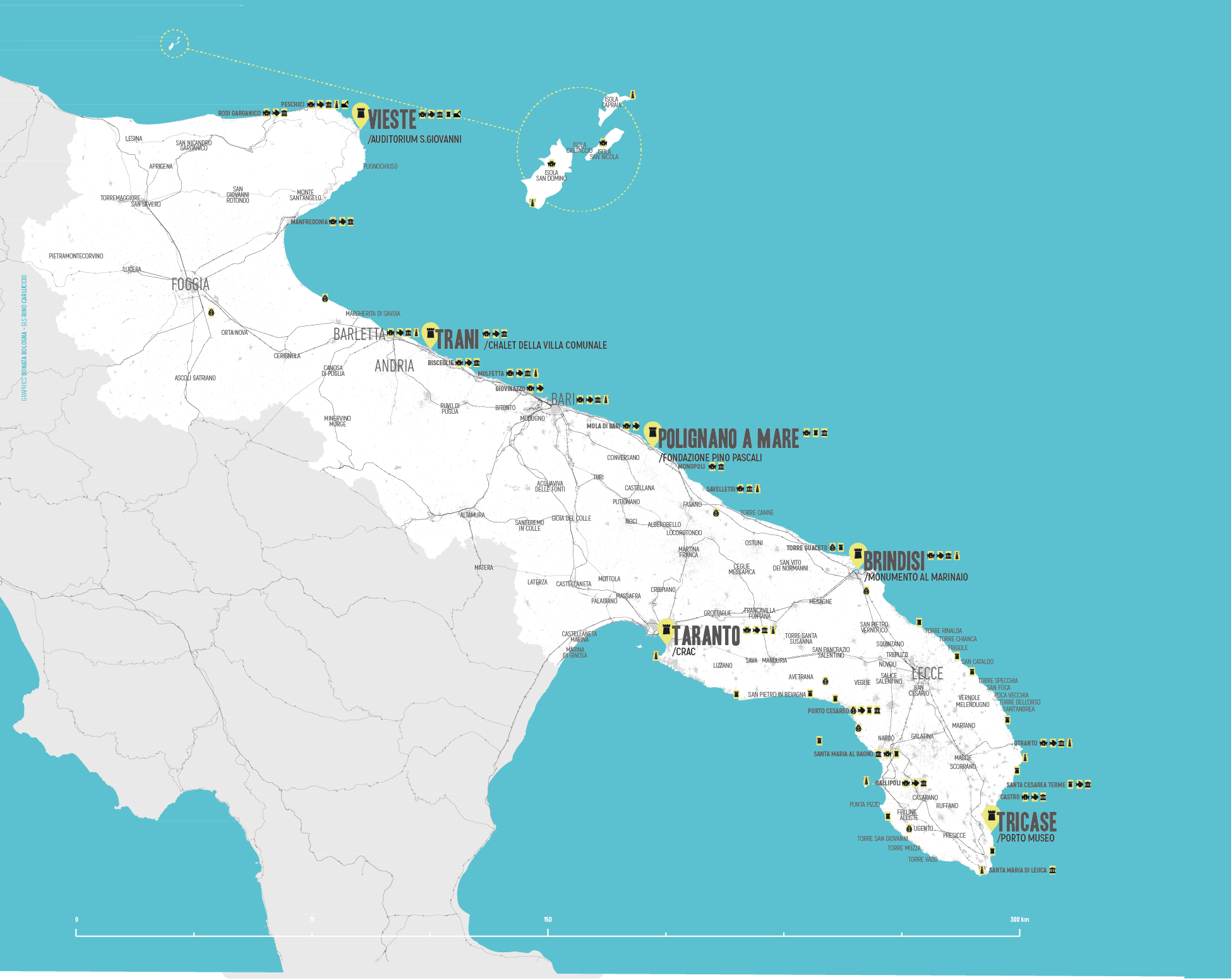 «I sette artisiti Luigi Presicce, Pamela Diamante, Lucia Veronesi, Coclite/De Mattia, Elena Bellantoni, Gabriella Ciancimino a guardia di sei torri contemporanee (Auditorium San Giovanni a Vieste, Chalet della Villa Comunale a Trani, Fondazione Pino Pascali a Polignano a Mare, Monumento al Marinaio a Brindisi, Porto Museo a Tricase, Crac a Taranto) «in una mostra che si fa essa stessa architettura, design, infrastruttura.