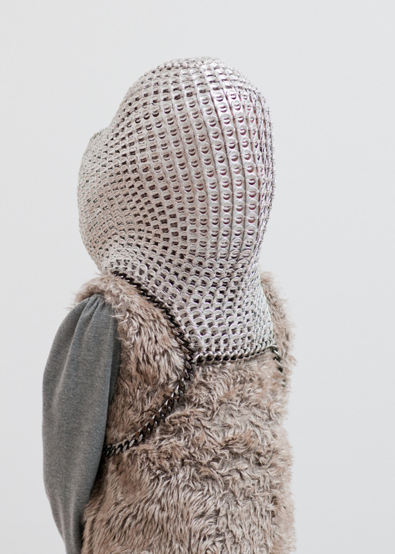 Alla familiarità e banalità delle situazioni evocate dalla selfista in blu Minzenmay risponde, in mostra, con la serie ritratti fotografici di … bambine? Bambini? Di nessuno dei ritratti è visibile infatti il volto. A volte possiamo solo intuirlo, perché è celato al nostro sguardo: nella maggior parte dei casi da capelli oppure da mani, altre volte da decorazioni simil origami o borse di cotone come maglie di armature. Nessun contesto aiuta, le silhouette a colori, a mezzobusto, si stagliano su un neutrale sfondo bianco, sempre uguale, che rafforza la loro natura di statement – “Protected Privacy!” come esorta il titolo della mostra alla galleria foto-forum di Bolzano.