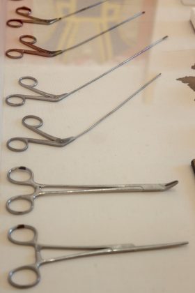 È lo stesso entourage del Museo ad essersi occupato di un allestimento che, tra ambienti saturi di oggetti pittorici e non, tira dritto alla creazione di un percorso immersivo. Catartico come l’artista comanda; organizzato come una specie di bolla in still life, in cui opere-cimelio segnano la centralità della parte riflessivo-performativa rispetto a quella strettamente pittorica (approfondita dalla sede milanese di ABC). È un progetto dalla vocazione documentativa, sia nella scelta dell’arco temporale (1962-2020), sia nel proporre tavoli firmati dall’artista, contenenti infilate di oggetti; pezzi a servizio delle azioni rituali nitschiane, perpetuate – a tutto vantaggio dei posteri – nelle macchie (anche) di sangue rappreso su teli e vesti. Tracce di una dimensione partecipativo-collettiva, intrappolata nelle impronte dei piedi di chi ha preso parte a 158.aktion, performance del 2020 realizzata presso il Museo Nitsch.