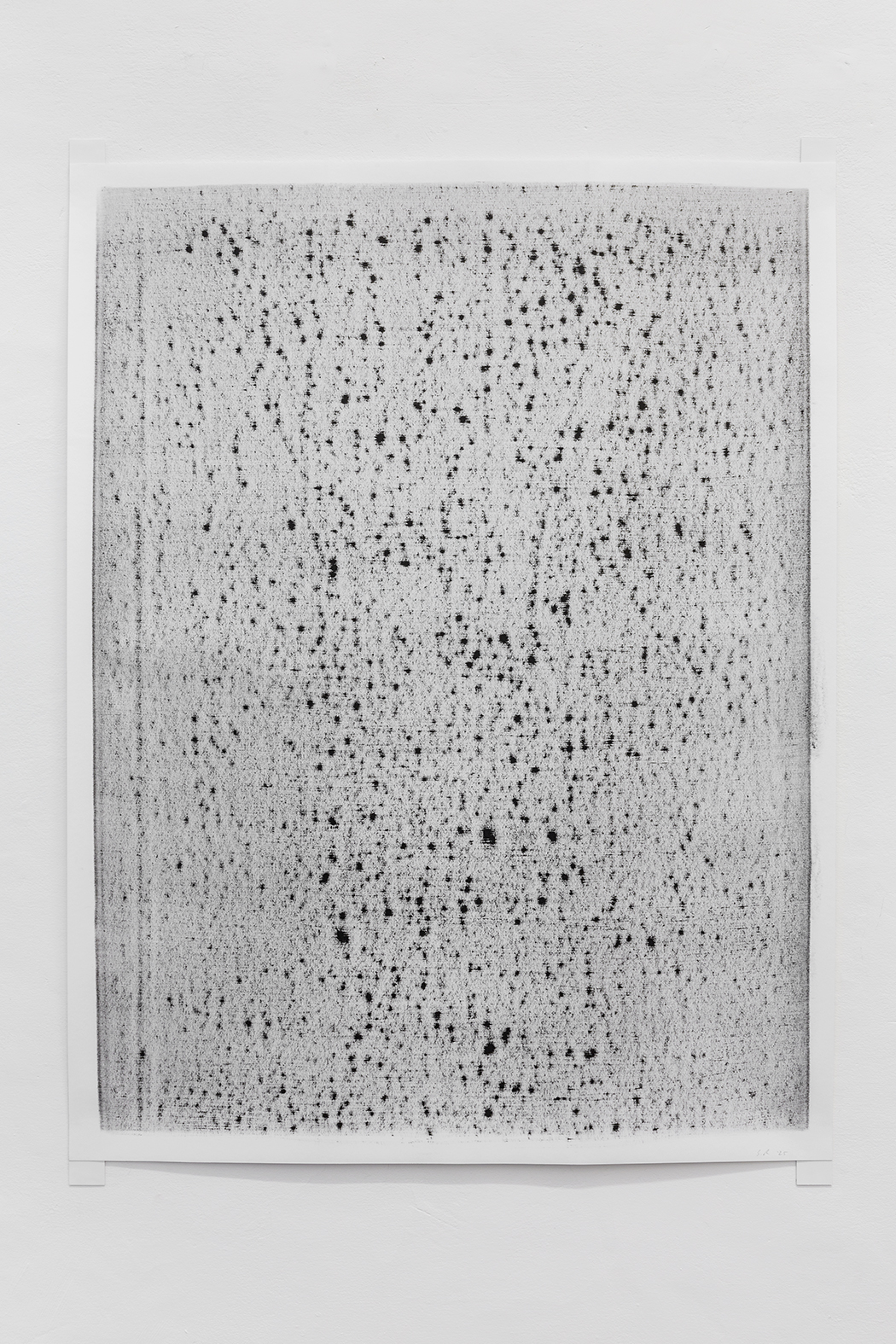 In mostra, le carte intelate dipinte a inchiostro e organizzate secondo una composizione schematica tripartita, assumono la forma di proiezioni psicanalitiche. Le superfici raccolgono tracce verticali e orizzontali, che disposte con ritmo intermittente, costruiscono scenari sospesi dove la narrazione si dissolve in un campo di possibilità immaginifiche. In questo caso l’azione della sottrazione figurativa diventa un gesto generativo: ciò che viene cancellato lascia spazio a nuove configurazioni, che oscillano tra il sacro, l’organico e il sintetico.
