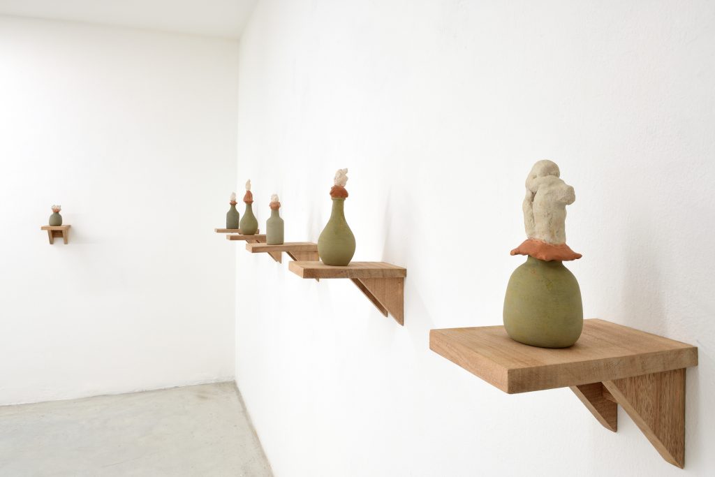 Accanto alle ‘Figure senza nome’ troviamo gli ‘Araballi’ (2024-2025), ampolle sacre in terracotta e argilla che riprendono la forma delle antiche boccette per profumi. Nel suo celebre saggio Profumi e Sensibilità, la sociologa Karen A. Cerulo scrive che attraverso le essenze «le persone danno senso al loro mondo sociale». I profumi diventano un linguaggio per comprendere e abitare il mondo: «gli odori trasportano e trasmettono significati. Con la stessa potenza di una parola o di un’immagine, ci raccontano qualcosa di noi stessi e di ciò che ci circonda». Nella pratica di Fogli, questa dimensione sensoriale dell’olfatto si intreccia con la visione degli Araballi, che sembrano provenire direttamente dai cubicola di un’antica domus romana o dalla camera da letto di una giovane e curata nobildonna. Gli Araballi diventano per Fogli veri e propri «vasi custodi», evocando la sacralità senza tempo del rituale dell’ungersi, della cura di sé, di quel gesto intimo e dolce che è l’amor proprio.