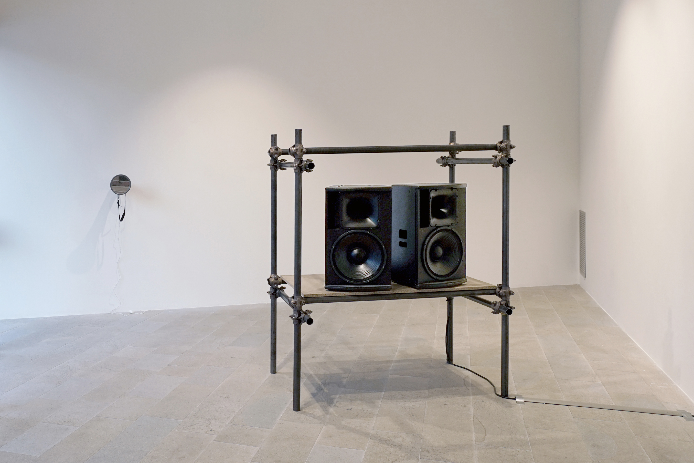 Due dispositivi, sono quelli attraverso i quali si svolge l’esperienza del visitatore. Il primo, quello visivo, consiste di una cospicua struttura in tubi innocenti che regge due pannelli sui quali ogni giorno vengono affissi altrettanti manifesti, immagini tratte dai Blitz compiuti da De Luca nello spazio pubblico o da altre opere, sempre connesse alla sfera dei rapporti tra individuo e sistemi di potere. Il secondo dispositivo, sonoro, consiste in una struttura analoga dove due casse trasmettono in loop una sequenza di opere audio, sonorizzando materiali, luoghi, inni nazionali. Due dispositivi, messi in relazione da un megafono installato sulla parete e attrezzato di un motorino che lo fa ruotare di 180 gradi, l’apertura, coperta da uno specchio, rende il visitatore parte della riflessione. È la posizione che la figura dell’artista, inteso come soggettività nella grammatica contemporanea della produzione culturale, copre da quando ha assunto autonomia rispetto ai poteri politici e spirituali. È la posizione che a fatica alcuni artisti oggi riescono ancora a mantenere rispetto a nuovi poteri amministrativi e finanziari del sistema dell’arte.