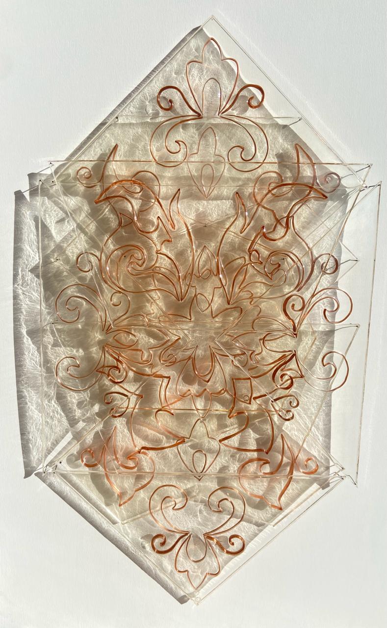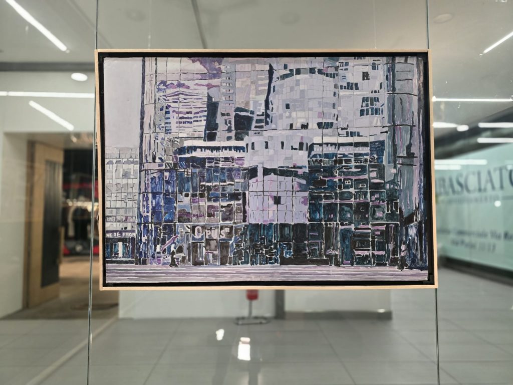 In Metamorfosi, ad esempio, elementi geometrici in resina custodiscono ed insieme rivelano arabeschi di rame, tracce di motivi naturali che, sovrapposti, restituiscono un corpo sospeso tra figurazione e astrazione. La trasparenza pulsante della resina funge da varco, rivelando linearismi sottili e preziosi, come cellule nervose di un organismo in trasformazione. L’opera è un mosaico sensibile, in bilico tra permanenza e dissoluzione. Riflesso al tramonto invece è un’esperienza liminale dove la pittura ad olio si fa specchio e vertigine. L’opera mette in scena, immersa in uno scenario urbano, un’interazione continua tra interno ed esterno. In questo scambio, la realtà si rivela instabile, oscillante e profondamente disorientante. E il riflesso tradotto su depron diventa dispositivo di reinvenzione del reale.