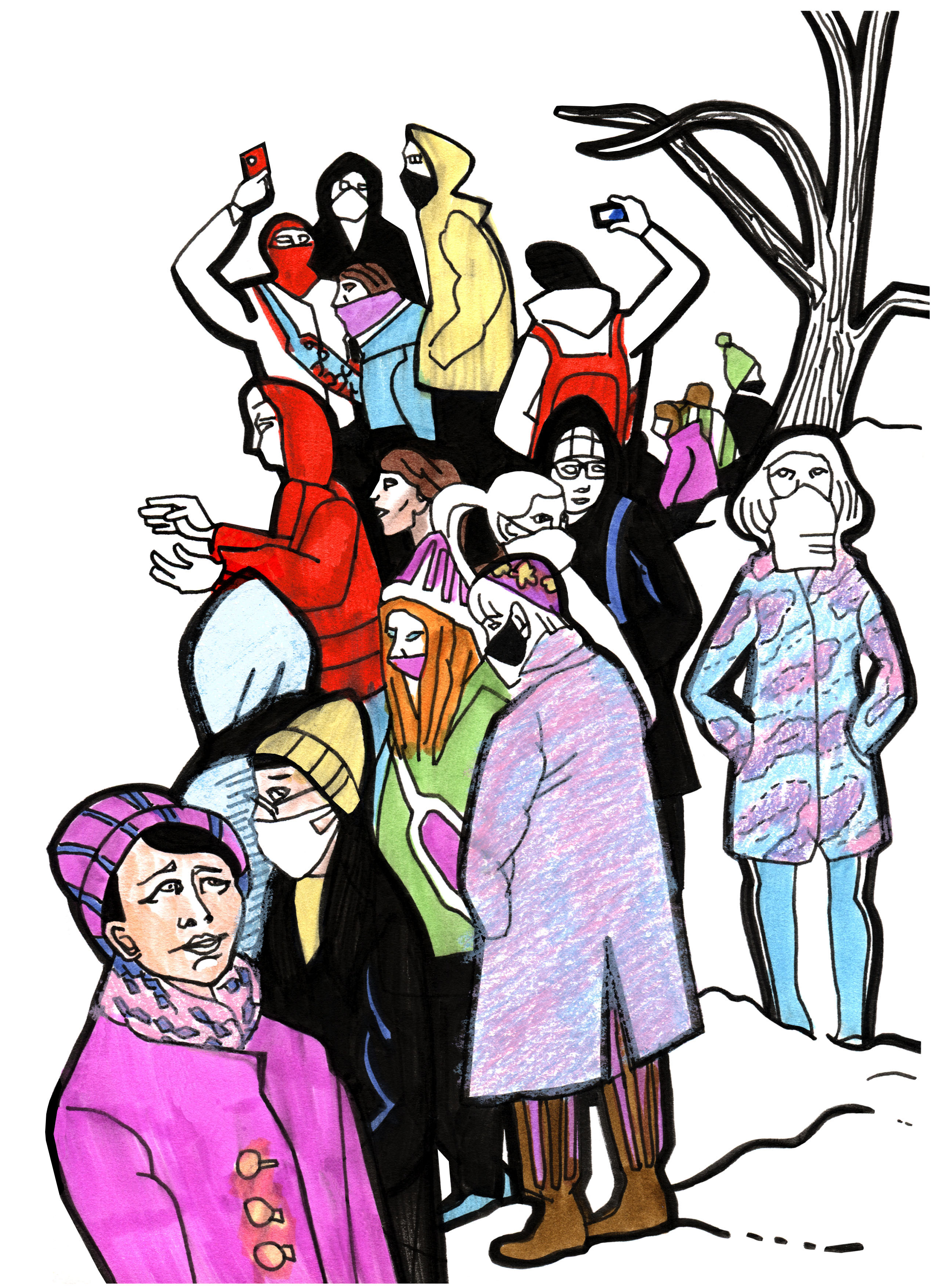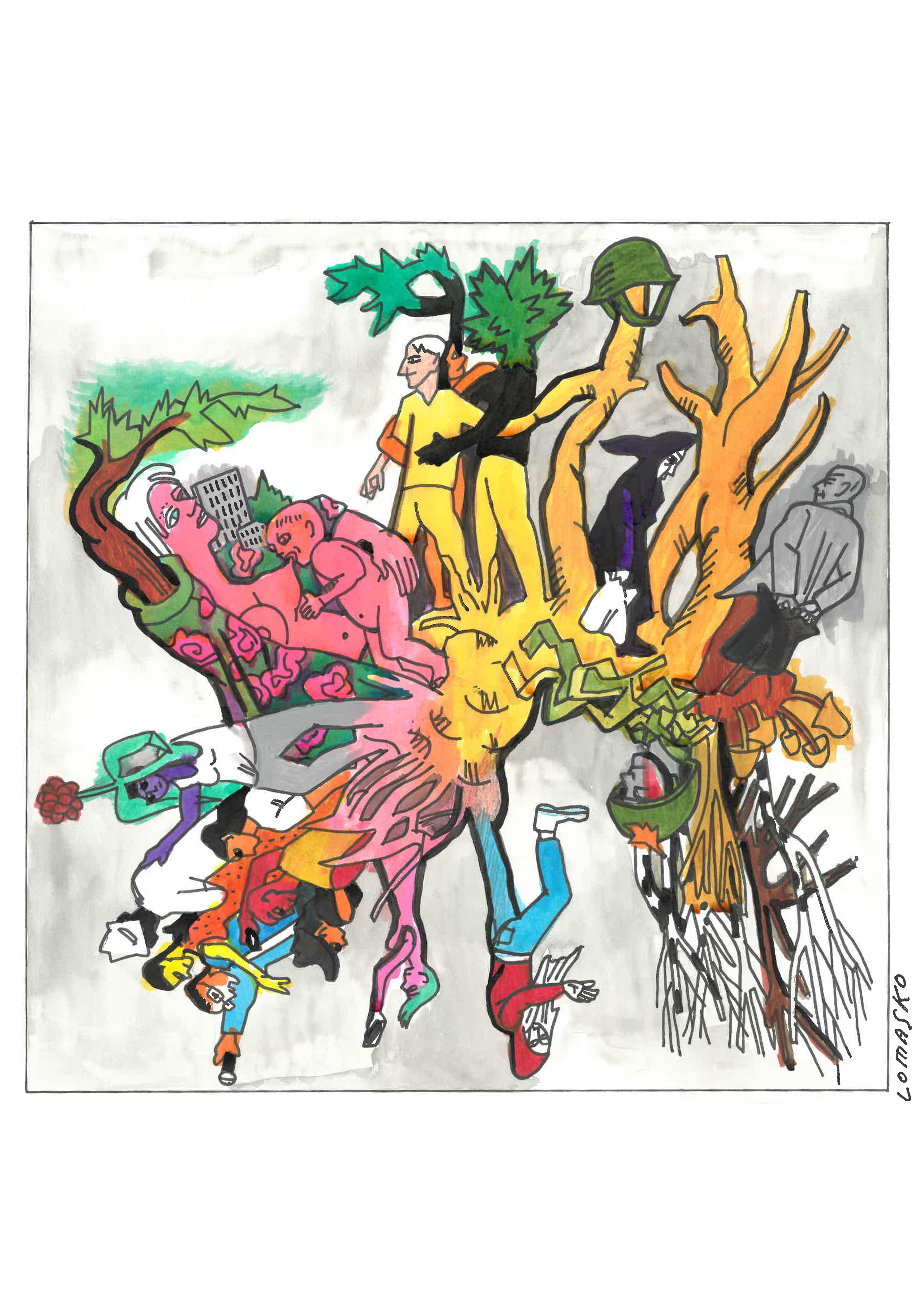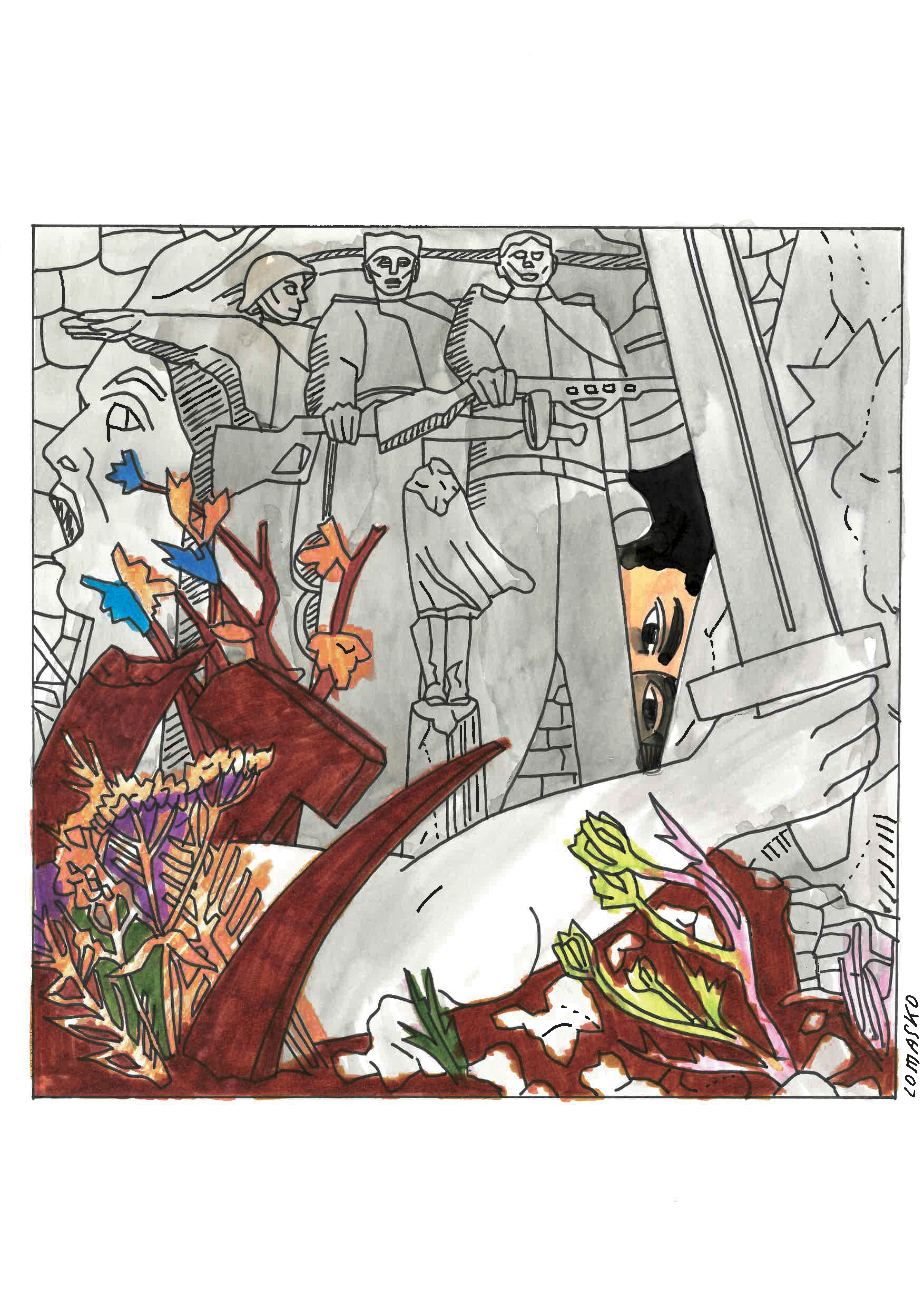 Un’artista che ha molto da dire: la prova è la varietà della rappresentazione dei soggetti, ma con un comun denominatore, il tratto grafico e i temi. La mostra è divisa in diverse sezioni che ci fanno entrare profondamente in contatto con chi cerca di conquistare la libertà e i diritti negati. Ognuna raccoglie la sua ricchissima produzione. Nella prima sezione Frozen Poetry ci sono opere che mostrano la mediazione degli artisti con il potere come il padre della Lomasko, che ha dovuto disegnare per il regime sovietico pur non approvandolo. Invece l’opera Snowdrop Generation, analizza le istanze rivoluzionarie degli artisti degli anni ’10 traditi poi dalla politica successiva.