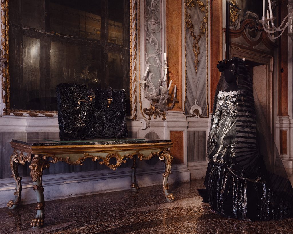 E dunque, ecco alcuni degli oggetti e dettagli che si possono ammirare, tra mostra e ambiente storico: posate ruvide in bronzo e acciaio di Damasco; collane di corallo; petali e steli in vetro di Murano; un soffitto affrescato da Tiepolo; sedie d’epoca e sedie di design; le silhouette d’archivio di Rei Kawakubo per Comme des Garçons; le sculture ambigue e polverose di Peter Buggenhout; coppe colme di ametista; La Vittoria della Luce sulle Tenebre di Guarana. E poi ancora: pizzi, velluti e crisalidi in oro, perle, rubini e diamanti.