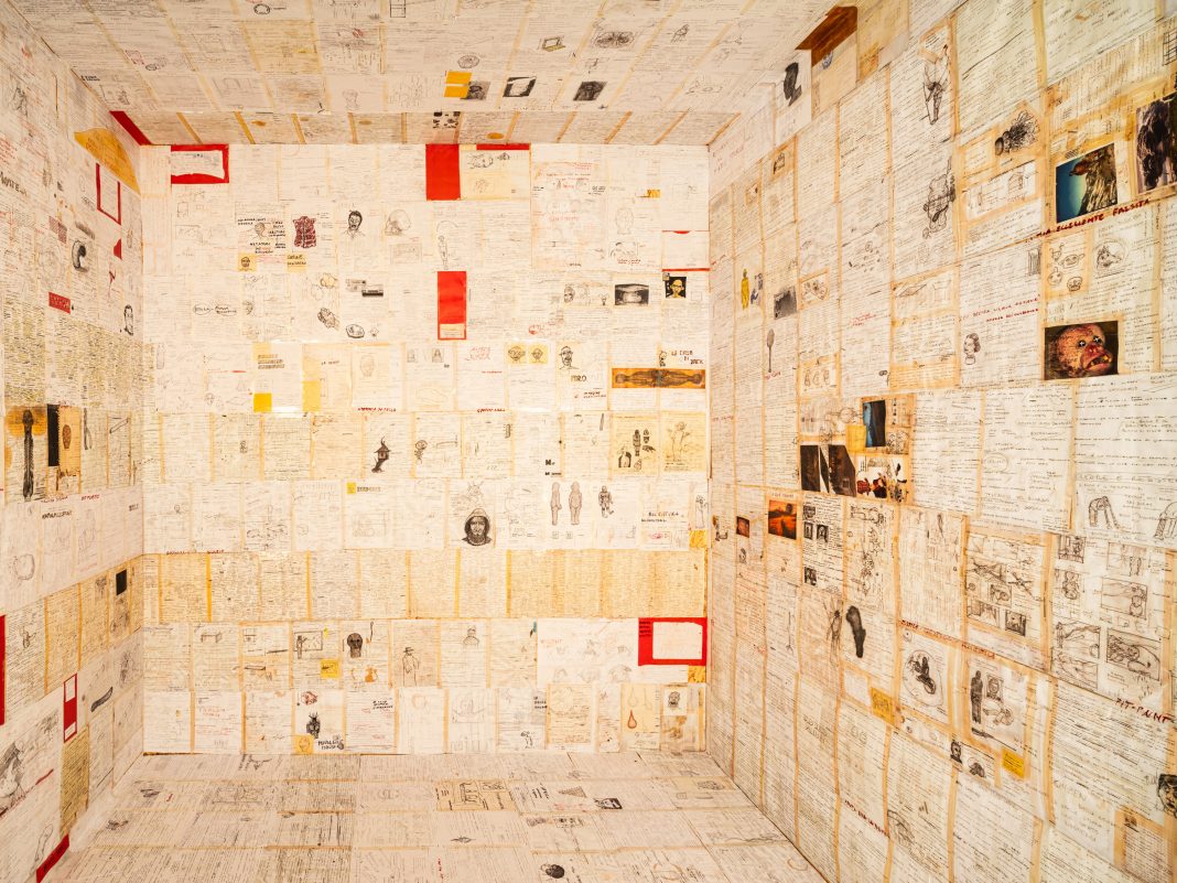 Beninteso che non si tratti di un modus operandi ma, anzi, di un’evacuazione, di un’espulsione che attiene a un registro di approcci difformi che Giaconia intrattiene nel tempo, l’idea è quella di usare questo bunker come una specie di teschio, di recipiente, di scatola nera, addirittura di scatola cranica, dentro cui stipare con la logica della tappezzeria – quindi con il nesso del tessuto o della pelle che viene ricucito e riaccoppiato – un agglomerato di “appunti trapuntati”, pagine e fogli scritti e disegnati che, lui de-compone da oltre dieci anni, con pensieri sfusi, note, parole in libertà, immagini, i riferimenti, appropriazioni, moltiplicazioni virali e suggestioni che lui fissa ogni qualvolta ne sente il bisogno: «come un grande gioco che diventa giogo – spiega – perché di fatto il gioco è sì una pratica biologicamente essenziale ma diventa anche un sistema di auto condizionamento, siamo noi del resto i primi fabbricanti dei nostri vincoli che esperiamo a partire da cosa può il nostro corpo».