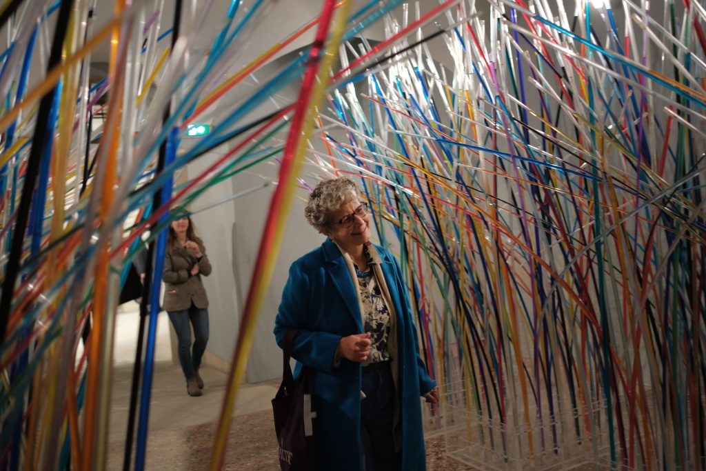 Downsbrough, a partire dai primi anni Settanta, ha sviluppato una ricerca verbo-visuale integrando assieme scultura, video, scrittura, fotografia, e invitando ad indagare la percezione dello spazio, spesso tramite segni verticali come linee, pali e confini della stessa architettura urbana. All’interno di edifici, guida, tramite l’uso della parola, di lettere e linee adesive, alla lettura dell’ambiente, ad una maggiore consapevolezza del tempo e dello spazio che abitiamo. Non è possibile infatti, osservare l’opera di Downsbrough (in mostra Two pipes, one standing e Power/from to with) senza cogliere contemporaneamente lo spazio circostante, una simultanea doppia lettura/assimilazione che invita ad un discorso aperto sul cambiamento continuo e sulla posizione dell’individuo rispetto l’opera d’arte.