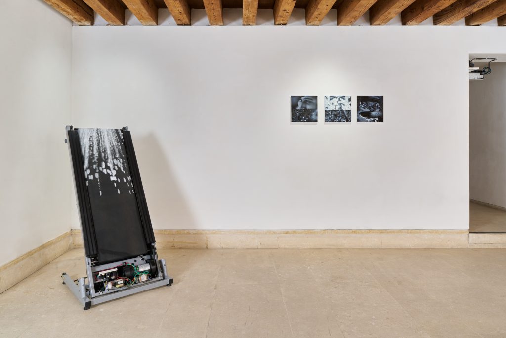 Nella sala adiacente, Giovanni Borga prosegue questa riflessione traducendo in installazione meccanica i gesti ossessivi e ripetitivi che rendono il tempo un loop algoritmico, un rituale compulsivo del consumo visivo. Al contrario, Book of Hours di Robert Blatt restituisce una temporalità incarnata nella forma del libro, luogo antico di sedimentazione e dilatazione, qui reinventato come dispositivo interattivo che plasma il tempo in relazione allo spettatore.