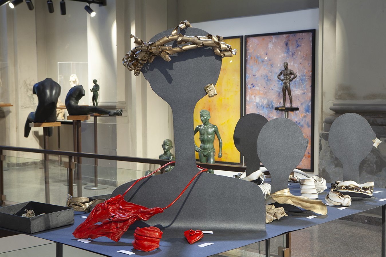 «Dovrei parlare di collane, bracciali, borse, ventagli, etc. invece voglio far notare due mie ultime opere che ho creato proprio per la mostra che è collocata all’ interno del museo dedicato a Francesco Messina. Ho scelto di proporre una grande installazione composta da cinque personaggi: danzatrici e danzatori…a richiamo delle opere sublimi di Messina dedicate al soggetto delle ballerine classiche rappresentando i loro corpi armonici. Nel mio lavoro invece ho voluto rappresentare il mondo interiore di questi professionisti, un mondo difficile, di grande sacrifici, di competitività a volte esasperata, dove la bellezza estetica è nascosta da situazioni di grande sofferenza…gambe esili…corpi grossi e una grande instabilità! Questa installazione come le altre è stata eseguita con materiale riutilizzato!