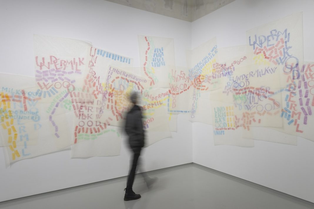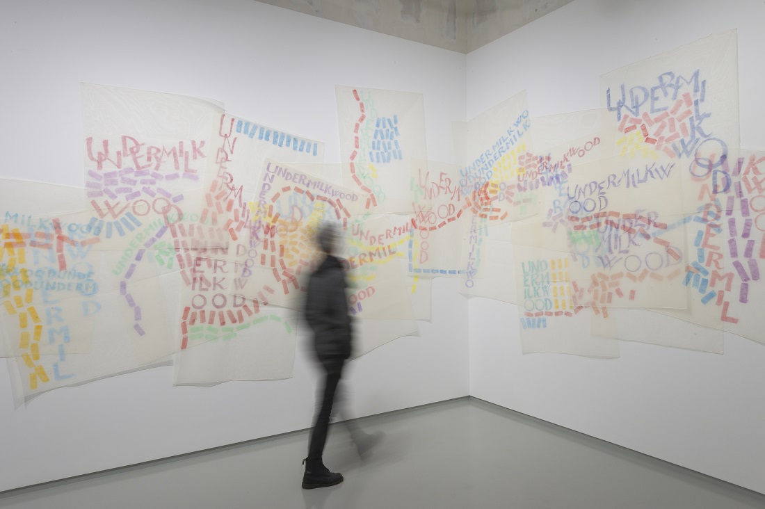 Segue, in mostra, un lavoro molto più recente, un’installazione creata con fogli trasparenti che possono essere posti ogni volta in modo diverso, interagendo dinamicamente con lo spazio espositivo. L’opera s’intitola Undermilkwood, è del 2019, ed è ispirata ad una poesia di Dylan Thomas.