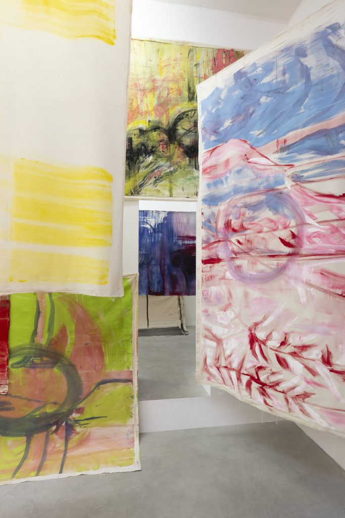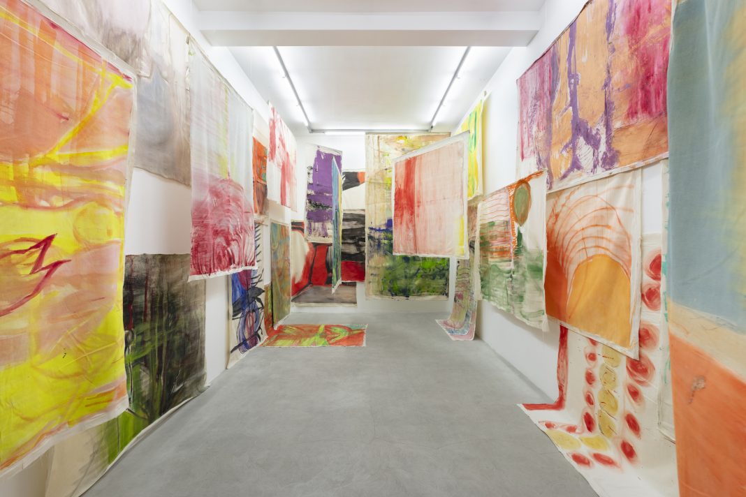 Tintin Nina Disco non è un titolo qualunque: Tintin, Nina e Disco sono gli amati cani di Vivian Suter, delle cui zampe capita sovente che le impronte compaiano sulle tele, insieme all’acqua piovana, alle macchie di fango o ai graffi provocati da rami di alberi. Sono oltre 50 le opere, di grande dimensione e senza cornice, ora esposte al piano terra dello spazio milanese di Kaufmann Repetto in un turbinio felice di colori vivaci che ricordano lo spazio circostante la casa in cui Suter vive dagli anni ’80: una piantagione di caffè, sulle pendici di Panajachel in riva al lago Atitlán, in Guatemala.
