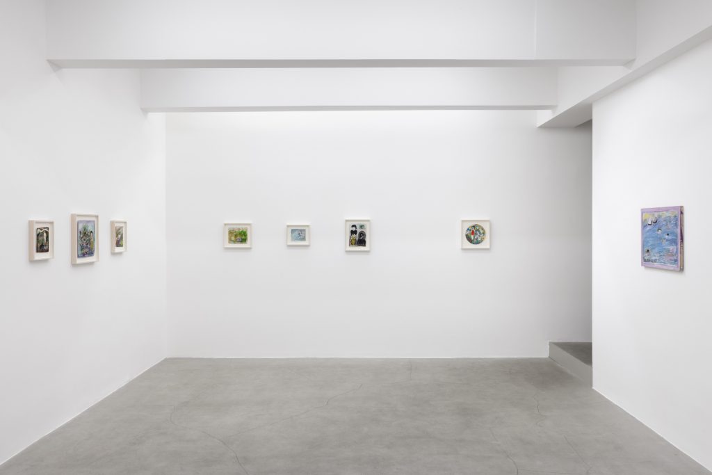 Dalla foresta tropicale, scendendo di un piano, ci si sposta nel villaggio di Tskaltubo, nella Georgia occidentale, dove Elene Chantladze fin da bambina ha scritto storie, tenuto diari e raccolto pietre. Ha smesso di dipingere sulle pietre quando alla morte del marito (perché in Georgia le pietre sono associate alla morte), ma ha continuato a impiegare supporti propri dell’ambiente che l’ha sempre circondata per creare corollari visivi per le favole che ancora contornano il suo immaginario: ritagli di carta, pezzi di cartone, pannelli di mobili, pagine di vecchi calendari tagliate irregolarmente, piatti di plastica usa e getta.