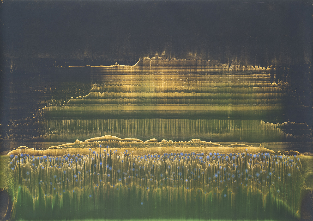 Il miracolo del colore, nelle opere di questa mostra, è frutto di una lunga gestazione. Si palesa in agglutinazioni inaspettate grazie alle emulsioni di polveri di bronzo, alluminio e rame mescolate a colore diluito. Nel suo procedimento di lavoro, Montani, come sempre, contempla e accoglie l’entropia della materia, gestita nel corso di una intensa performance fisica sull’opera e con l’opera, muovendo il supporto cosicché il colore se ne appropri e trovi una propria geografia. Il quadro “accade”, come sostiene l’artista.