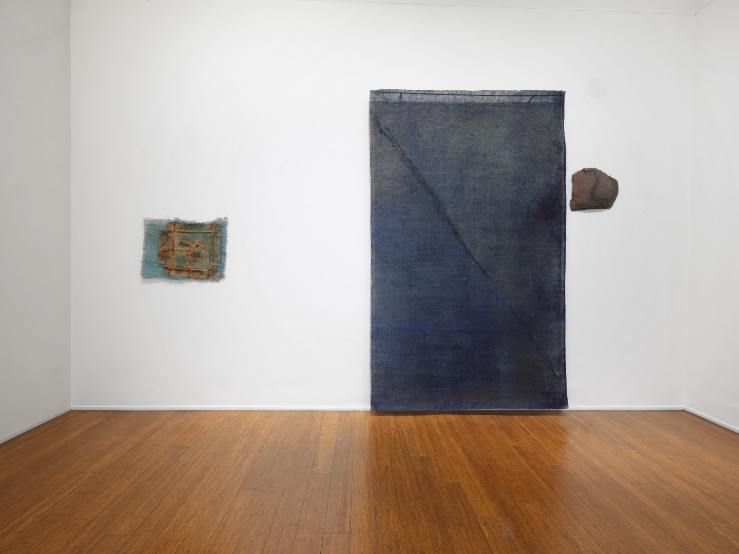 Mire che non faticano a saltare fuori. Le Trasparenze sono infatti materia pittorica, ma la materia in generale per Valentini è strumento di scoperta, spazio di ricerca, varco verso una realtà ancora inespressa. La mostra offre tutti pezzi inediti, ben scelti nell’ottica di una narrazione dialettica, senza dimenticare una fondamentale linea temporale (non troppo definita: dialettica vince su cronologia). Valentini parte, nel ’73-’74, da un telaio in legno in cui circoscrivere una leggera struttura rada di corde leggere e brandelli pigmentati, per poi migrare – nel biennio successivo – verso una garza libera e un cromatismo più consistente. Quindi verso una matericità in via di sviluppo, che lo vede mettere in chiara discussione ogni regolamentazione formale, come si nota in un paio di opere che da ABC-ARTE non si sono fatti mancare: una piccola garza strappata con un moto trasversale, sincopando il ritmo pittorico verticale, oppure in un rettangolo in metallo sottile che abilmente non inquadra la garza precisamente formata per accoglierlo. Fino a raggiungere, sul termine dei ’70, situazioni mixed media in cui lo spazio è determinato dalla sovrapposizione di malte. Biglietto di sola andata verso la plasticità schietta ed orizzontale di interventi importanti come l’imponente Focolare di Hestia (che già da solo vale la visita), o mistica e ascensionale come La terra della sera, espressioni in purezza di un artista troppo poco artefatto per lasciarsi scivolare dalle mani quell’approccio sacrale e vivo alla materia.
