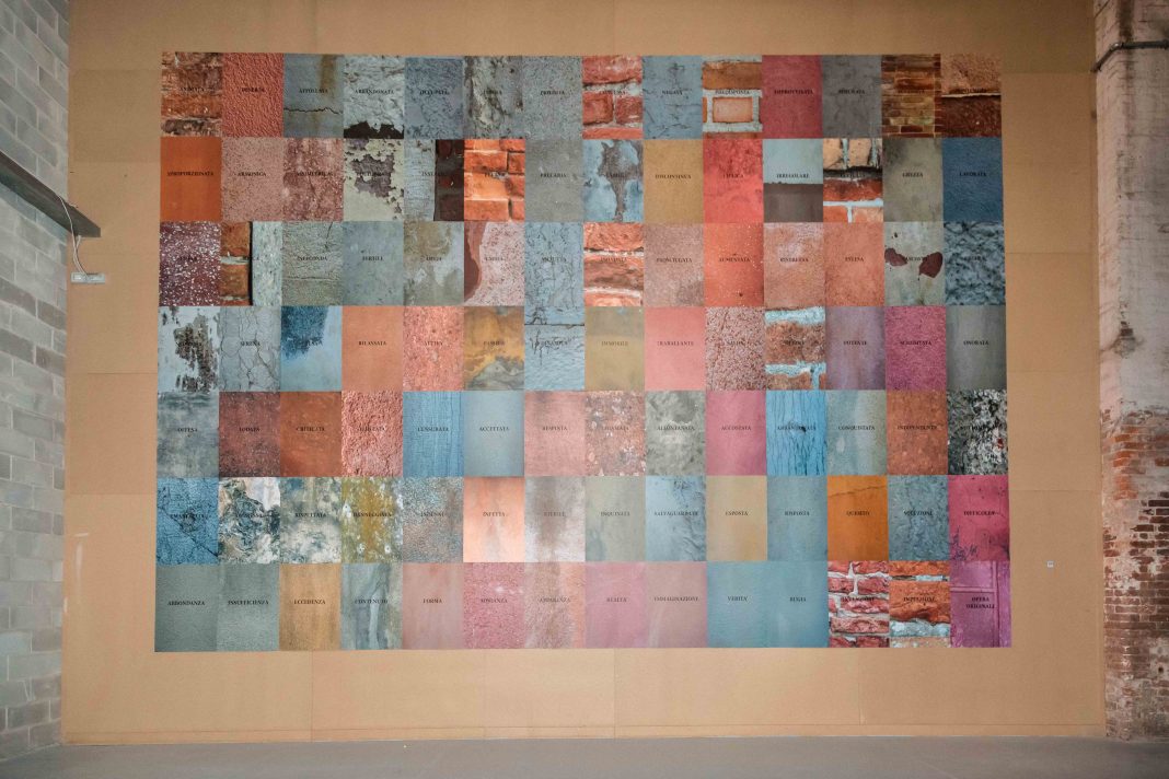 L’esposizione Contrappunto ben sintetizza questo stretto legame con la città lagunare, che ispira il lavoro di Giulia Mastrangelo. Infatti, appena varcata la soglia dell’area espositiva, veniamo travolti da Enarmonia, 2023, una parete infinita di parole composta da quarantanove riquadri che riproducono in sequenza le superfici di ogni palazzo dell’isola della Giudecca, da Zitelle al Mulino Stucky.