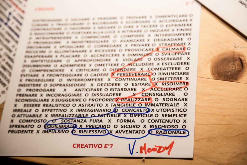 I colori vogliono infatti rievocare la panoramica cromatica della Giudecca, vista da canal Grande. Le parole a loro sovrapposte sono collegate da un gioco di contrari, che partendo da “animata” ci conducono a “opera originale”, riferimento a Sergio Bettini, che – ci racconta Giulia Mastrangelo – «nel suo scritto Venezia, la definiva “città originale” perchè interamente creata dall’uomo, come se fosse un’opera d’arte». L’installazione vuole portarci a riflettere e creare una discussione attorno al significato della città, ponendoci di fronte alle sue stesse contraddizioni.