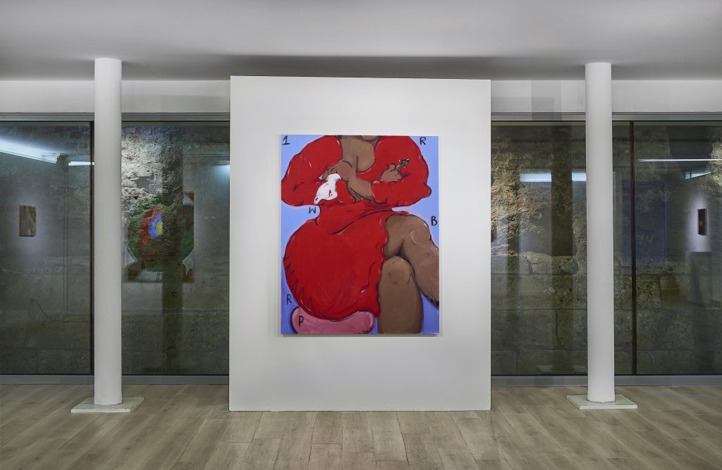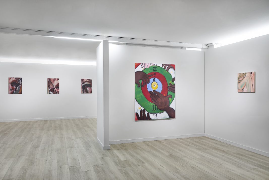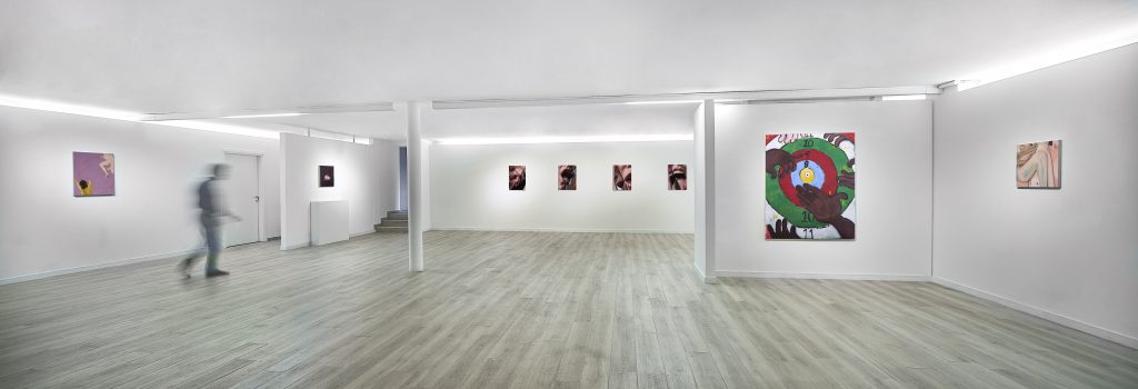 Olivia Sterling infine propone un’ulteriore sfumatura di visione critica femminile estendendola al concetto di razza. Le due opere esposte, che lavorano sinergicamente pur non essendo un dittico (ognuna in alto a sinistra ha un numero, 1-2, sequenziale), si contraddistinguono per uno stile che rimanda al fumetto e una palette di colori vivace e divertente che nascondo critiche molto profonde. In The Thrower una donna afro, ritratta secondo gli stereotipi condivisi, tiene in mano un bardo, mentre in Effing and blinding sul bersaglio del gioco delle freccette, tra tante mani di colore, una mano bianca sanguina. Le lettere sul dipinto si riferiscono ai colori per sottolineare – e criticare – la tendenza occidentale a volersi connotare (che dal punto di vista razziale coincide con il darsi e dare un colore), escludendo di conseguenza il diverso.