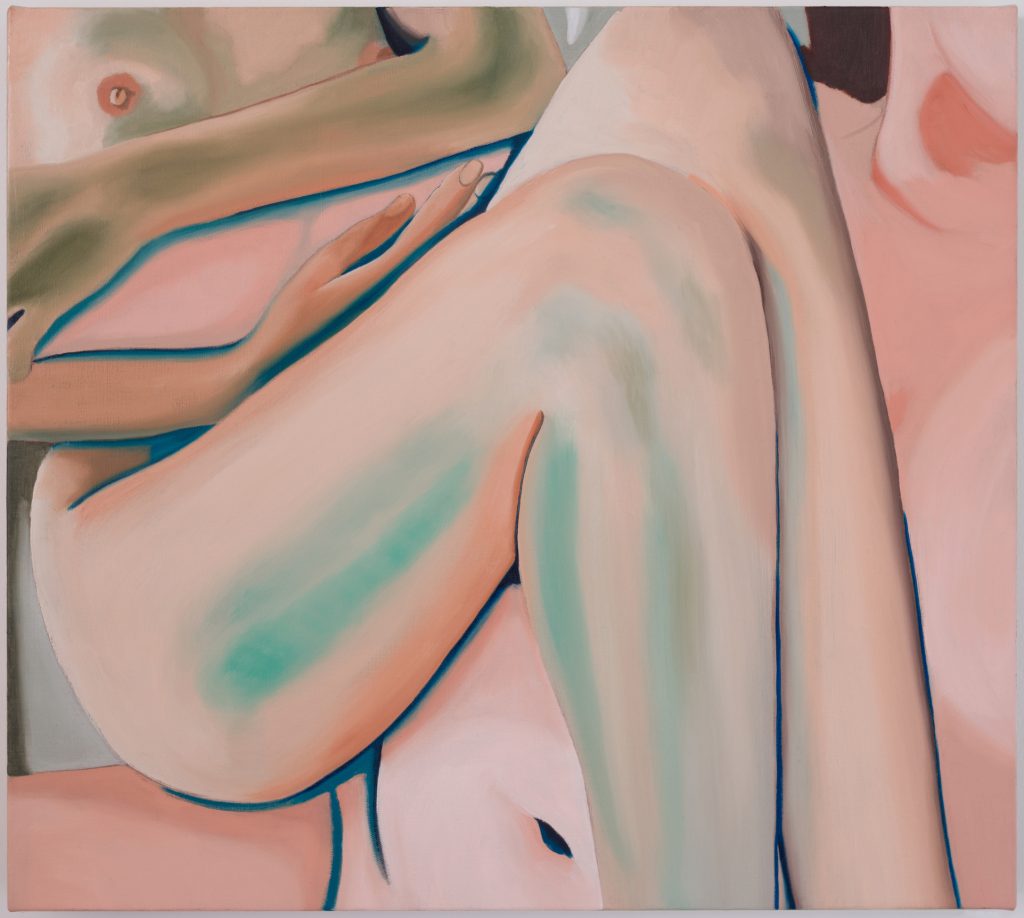 Yang Xu è ritratta, per mano di Victoria Cantons, anche nell’opera Untitled (A way to avoid the mess one makes of one’s life) raffigurante un abbraccio tra le due donne così stretto da non lasciare posto per altro. La tenerezza con cui i due corpi si fondono in un corpo unico appartiene alla poetica di Cantons, che porta in The Objects Stares Back un’amorevole e intima ipersensibilità e ipersensibilizzazione. Cantons appare anche nell’altra opera esposta, Untitled (Like good fruit, the balance of life lies between ripe and ruin) che significativamente mostra un cerchio, come a indicare un cerchio (di senso) che si chiude. Entrambi i lavori hanno un titolo che rivela la passione dell’artista per la poesia, strumento per completare a livello semantico – e comprendere – ciò che pittoricamente esprime.