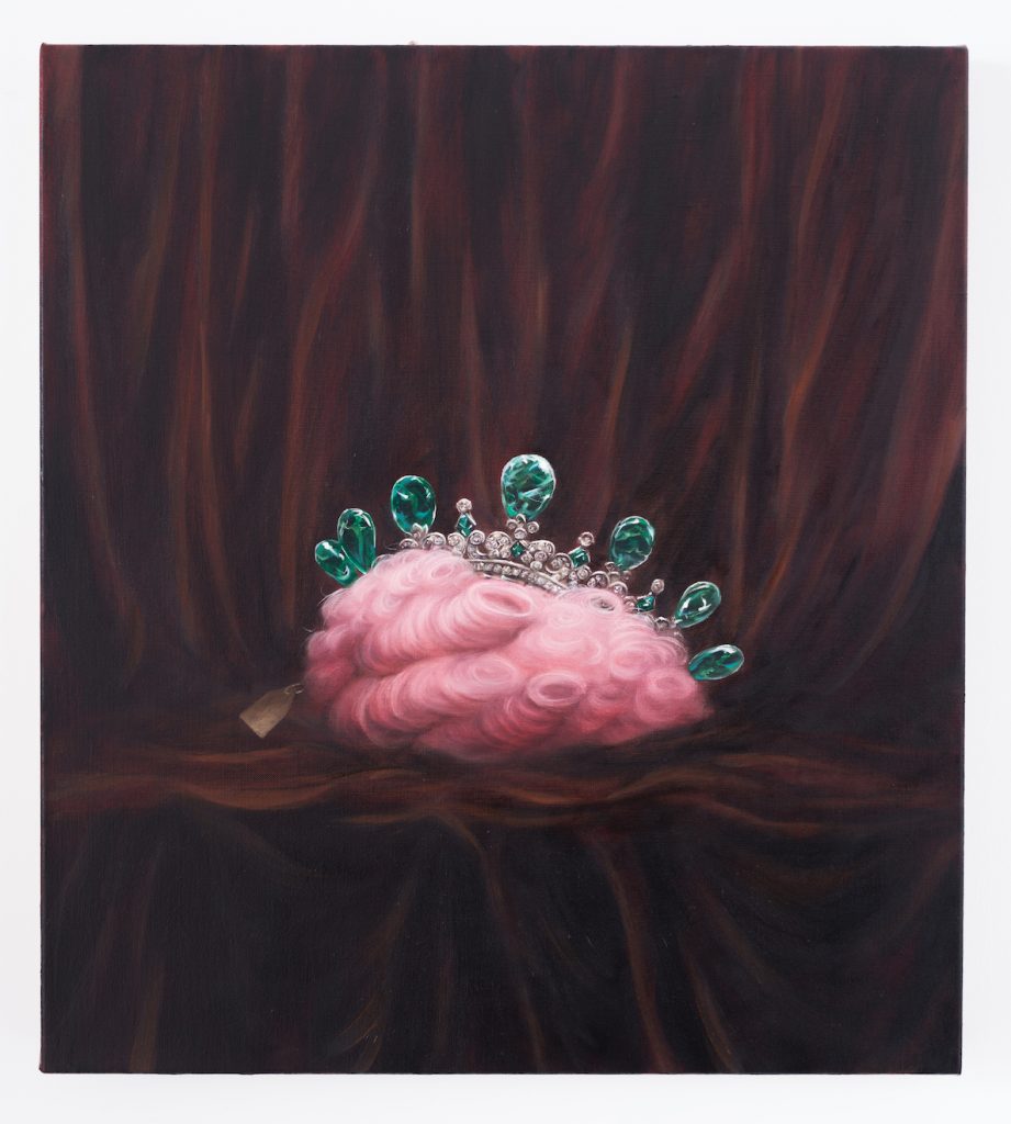 Dalla cinematografia alla storia, Yang Xu, artista queer e compagna di Victoria Cantons, ambienta le sue opere in epoca Rococò per tradurle in riflessioni sulle convenzioni e sulle politiche che ruotano attorno a genere, potere e rappresentazione. Con un atto performativo davanti alla tela, Yang Xu è solita autoritrasi con parrucche o armature per sottolineare la difficoltà che una donna, un’artista, asiatica e queer, deve affrontare per affermarsi e legittimarsi. Nel caso di What Does It Take To Be A Woman? insiste su un ideale di superdonna aggressivo pulsionale (labbra rosse, seni grossi e rifatti, sguardo voluttuoso e unghie lunghe) per criticare l’eccessiva ricerca dell’apparenza che porta alla mercificazione (Everything’s Got A Price) anche degli aspetti più spontanei.