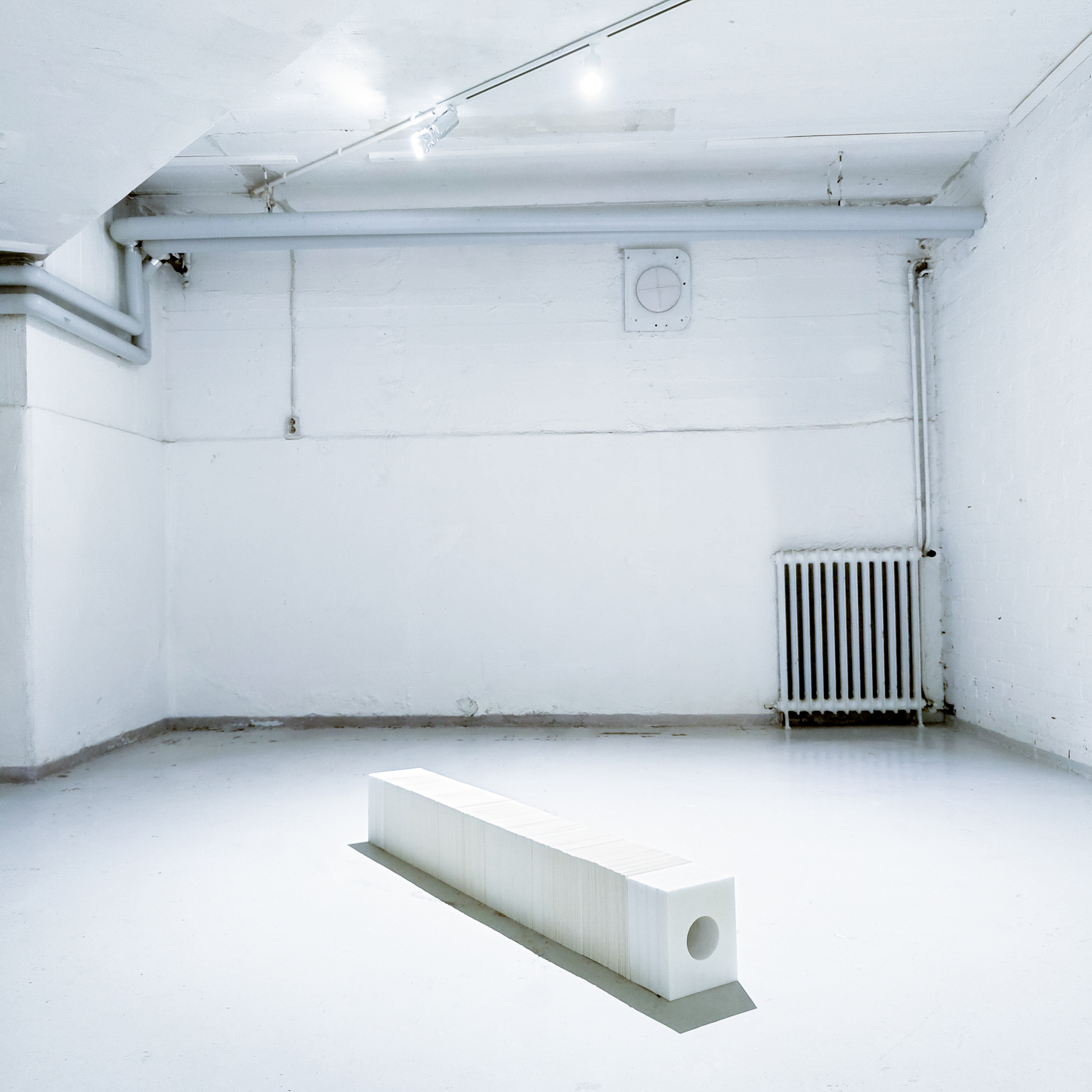 Installation View at Oksasenkatu11, Senza titolo, 2025, marmo e carta perforati, cm 16.9 x 20.1 x 140, ph. Piergiorgio Colone