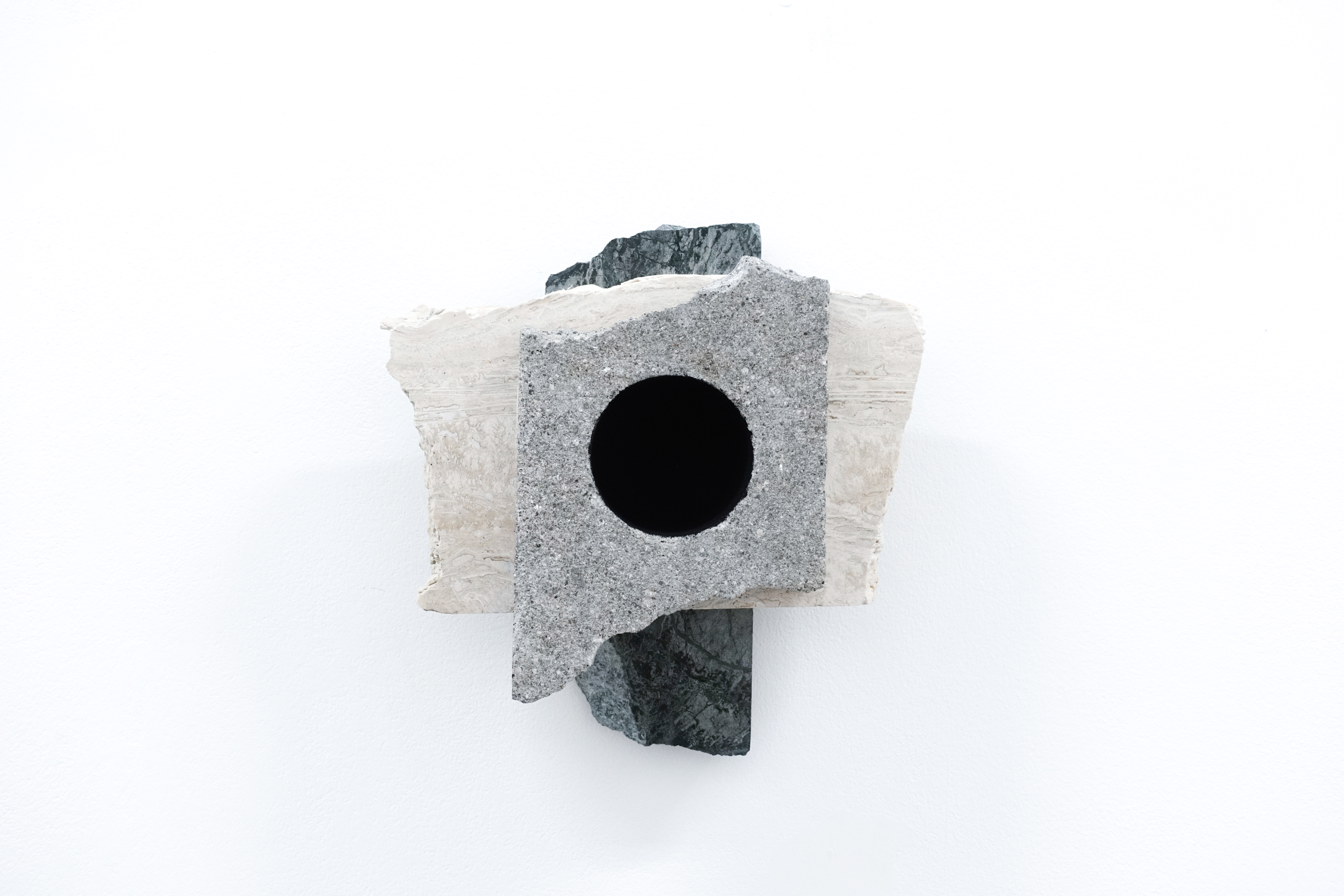 È tuttavia nella serie degli assemblaggi Punti di singolarità che la ricerca di Colone raggiunge una densità simbolica particolarmente significativa. Questi frammenti di marmo, provenienti da contesti geografici diversi e selezionati tra scarti ed eccedenze del processo produttivo, vengono uniti da un foro centrale, elemento minimo e costante che attraversa ogni esemplare. Ma quel foro non è semplice assenza bensì “materia inversa”, un pieno visivo, una soglia che assorbe lo sguardo e lo spinge oltre la superficie, aprendo uno spazio mentale in cui ciò che non si vede continua a esistere come possibilità.