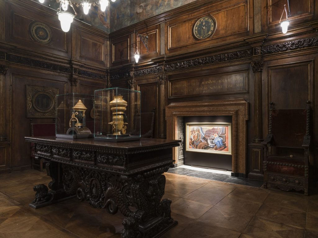 Nel Dopoguerra, l’attività di Depero stenta ad adeguarsi ai tempi nuovi, complice anche il suo isolamento iniziato negli anni Trenta, a Rovereto, lontano dai fermenti che andavano proseguendo negli epicentri dell’arte. La sua produzione rivela una perpetuazione dei suoi stessi cliché futuristi, oramai privati da quello slancio innovatore e brillante dei decenni precedenti, in cui aveva dimostrato grande versatilità come progettista, arredatore, scenografo e soprattutto grafico. Una mostra di Fortunato Depero al Museo Bagatti Valsecchi significa oggi non solo riattualizzare il suo legame effervescente con Milano, ma anche dar vita a una vera e propria contaminazione tra due linguaggi contrapposti, sebbene entrambi diretti alla conservazione della memoria. Nel mettere a confronto due realtà artistiche orientate al passato – al Rinascimento per il Palazzo, ai propri trascorsi progressisti per Depero – questa formula rispecchia un approccio comunque innovativo, perfino più provocatorio di quanto gli stessi curatori abbiano messo in conto, dal momento che dei quadri tardo-futuristi si infiltrano tra gli impianti decorativi esistenti con un quid di malizia e perfino di surrealismo.