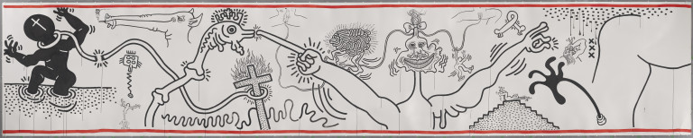 Un disegno ad inchiostro nero, con un bordo in vernice acrilica rossa, che si estende su una lunghezza di quasi 40 metri. Un’opera di tale portata non solo cattura l’attenzione, ma affascina lo spettatore grazie alla varietà di elementi rappresentati. Amsterdam Notes è una fusione di creature fantastiche, figure umane che danzano, fanno l’amore, volano e saltano. Una composizione unica che si discosta dallo stile caratteristico di Haring, offrendo una prospettiva nuova sul suo lavoro e creando un dialogo interessante tra l’artista e lo spettatore che si vede assorbito all’interno di questa grande opera disposta su 3 grandi pareti.