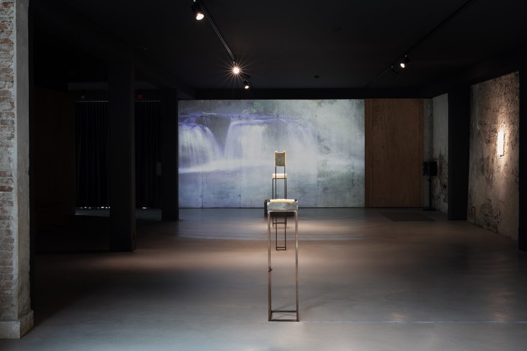 Disgelo esprime al meglio la poetica del suoi lavoro. Tale termine, infatti indica un momento sospeso, carico di attesa, in cui qualcosa sta per accadere. Può essere una rivelazione, un cambiamento o la rinascita stessa della natura. Un titolo che si riflette già nelle prime opere in mostra, come Aprile II, una scultura composta da una lastra di alabastro che imprigiona un ramo di capelvenere sotto il quale scorre dell’acqua. Le trasparenze dell’alabastro lasciano intravedere le foglioline imprigionate come uno strato di ghiaccio che svela la natura pronta a rifiorire con tutta la sua forza. La scultura dialoga in perfetta armonia con un video, pensato appositamente per questa esposizione, che riproduce ciclicamente immagini tratte da cascate, dettagli di zampilli d’acqua, schizzi, schiuma e onde, i cui suoni si propagano per tutta la galleria e accompagnano nella visita.