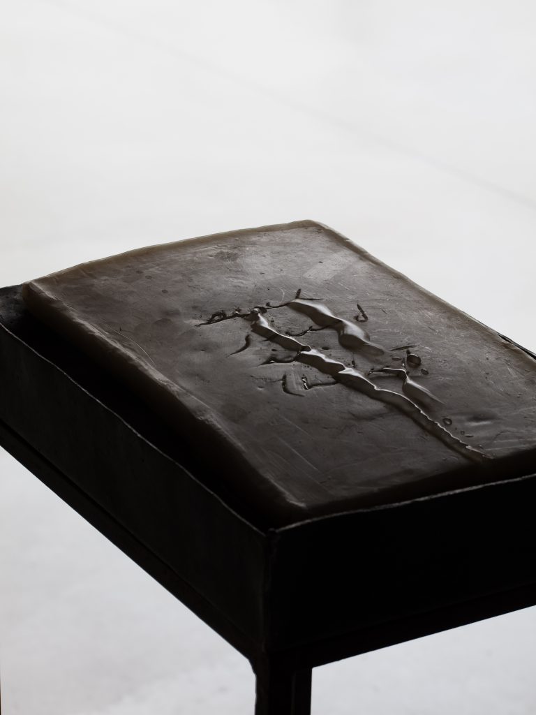 L’acqua, intesa come elemento simbolico, ritorna anche in Angelo sorgivo: una piccola casa realizzata interamente in cera, dalla quale, attraverso una fessura, si può osservare una piccola sorgente. Questo tema è presente anche nella più emblematica Each second is the last, realizzata nel 2020 in omaggio alla poetessa statunitense Emily Dickinson. Si tratta di una scultura-sorgente: una lastra di cera sulla quale l’artista incide i versi della poetessa, da cui sgorgano rivoli d’acqua. Trovarsi di fronte a quest’opera è un’esperienza intensa e affascinante. L’acqua che affiora e scorre sulla cera evoca il fragile confine tra presenza e dissolvenza, tra permanenza e oblio. Richiama immagini potenti e universali: una ferita pulsante che non si rimargina, una lacrima che solca il viso, il respiro del tempo che scorre inarrestabile. È un’opera che invita alla riflessione e che non lascerà indifferenti gli spettatori della mostra.
