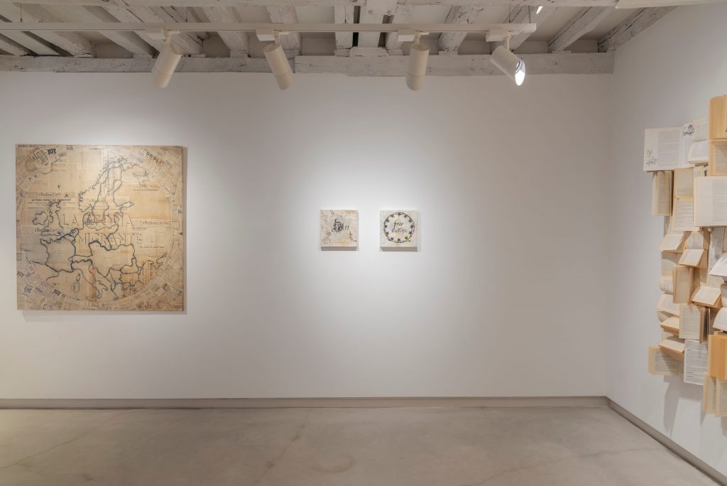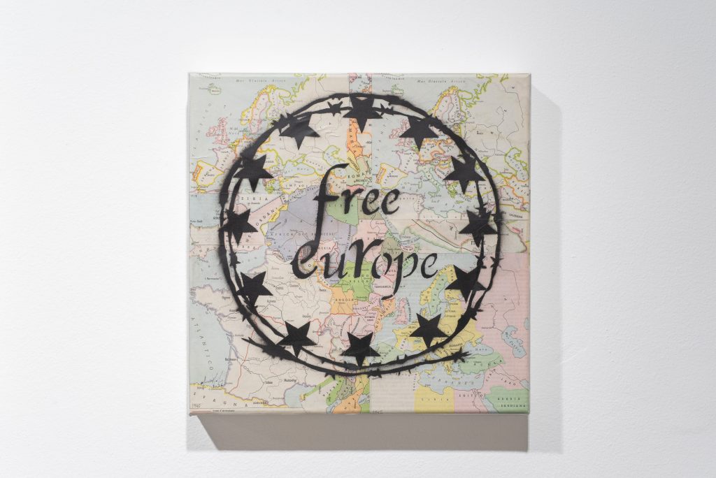 Molti dei lavori esposti da Marignana, infatti, nascono proprio da mappe e materiali editoriali su cui l’artista interviene con frasi essenziali, capaci di suggerire tanto una dimensione poetica quanto spunti di riflessione politica. In Free Europe (2026), ad esempio, è la dimensione cartografica a fare da tela per una scritta realizzata con vernice spray.