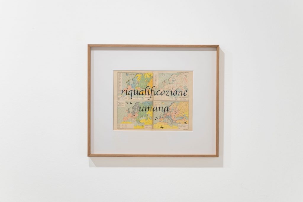 Se i confini e le denominazioni riportati sulla mappa possono inizialmente apparire oggettivi e neutrali, essi sono in realtà sempre il risultato di un’astrazione guidata da un pensiero ideologico ben preciso. Come ci ricorda Michel Foucault, ogni sistema di rappresentazione coincide sempre con un sistema di controllo. Opiemme mette però in crisi questo ordine prestabilito attraverso un gesto minimo ma incisivo, creando una sovrapposizione tra dispositivo ideologico e slittamento poetico: una dicotomia che si riflette nel titolo stesso dell’esposizione.