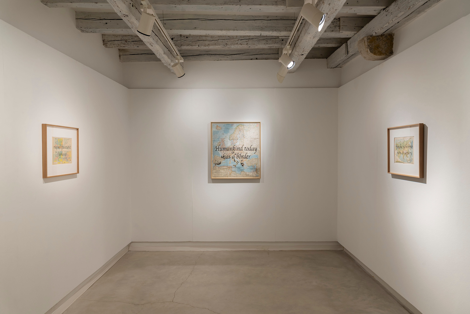 Se i confini e le denominazioni riportati sulla mappa possono inizialmente apparire oggettivi e neutrali, essi sono in realtà sempre il risultato di un’astrazione guidata da un pensiero ideologico ben preciso. Come ci ricorda Michel Foucault, ogni sistema di rappresentazione coincide sempre con un sistema di controllo. Opiemme mette però in crisi questo ordine prestabilito attraverso un gesto minimo ma incisivo, creando una sovrapposizione tra dispositivo ideologico e slittamento poetico: una dicotomia che si riflette nel titolo stesso dell’esposizione.