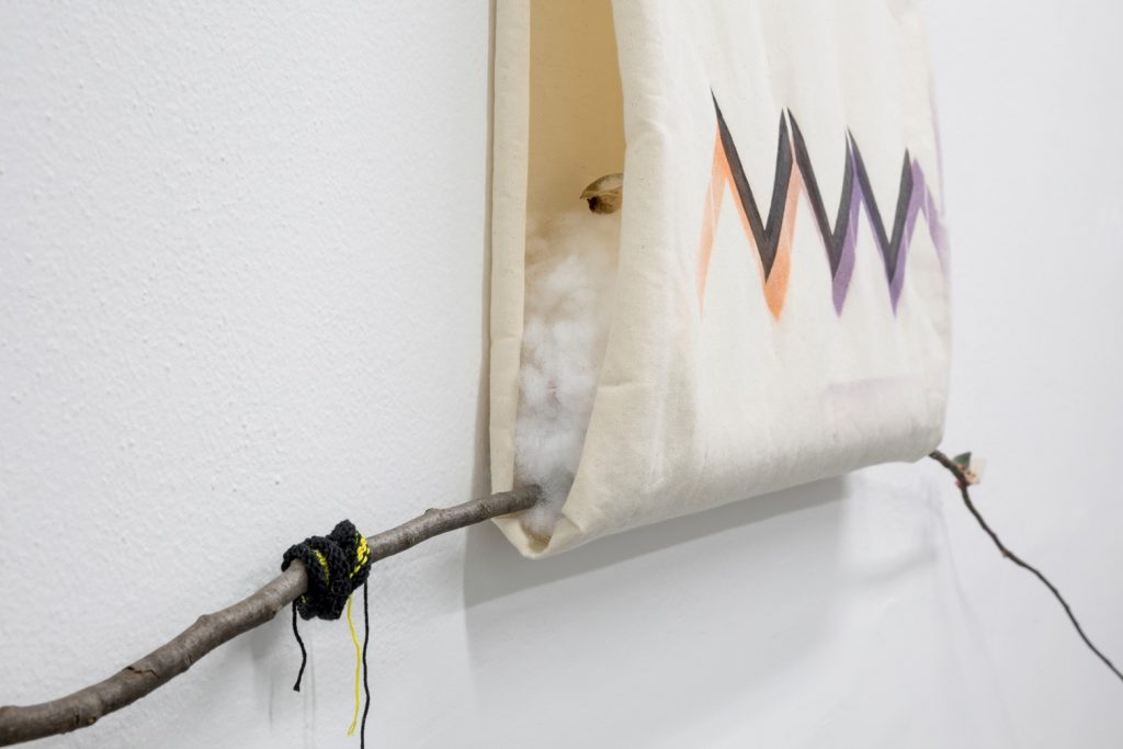 «L’inevitabilità della natura, quel che siamo. Penso che per migliaia di anni abbiamo concepito la natura in posizione laterale quando non inferiore all’essere umano (vedi Il Postumano di Rosi Braidotti), finché le neuroscienze o altre scienze non ci dimostrano che le intelligenze “altre” rispetto a quella umana non sono inferiori ma semplicemente differenti. Il linguaggio sembra porsi a un livello superiore, etereo, puro ma credo che i segni non possano che essere fisici, prodotti dal corpo, segni che vengono esternati per via di una tensione, una spinta a muoverli, a muoversi, a far uscire dalla propria dimensione qualcosa che riconosciamo e a cui attribuiamo un valore, una sacralità. Pensando a questa corporeità ho pensato al “testo-tessitura”, canvas naturale in cui rifugiare i corpi, le foglie o i rami che stanno tra la vita e la morte. Pensavo anche alla “mancanza di rifugi” di cui parlano Anna Tsing e Donna Haraway; il testo-tessitura te lo porti dietro, come un fagotto, una borsa, uno zig zag pieno di memorie familiari e storiche».