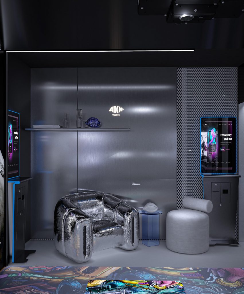 Questo ambiente, ibrido e sperimentale, con i suoi ampi schermi e le superfici coperte da un materiale argentato, ricorda da vicino un’ambientazione fantascientifica, proiettandoci così, fin dal primo sguardo, in una dimensione metafisica.