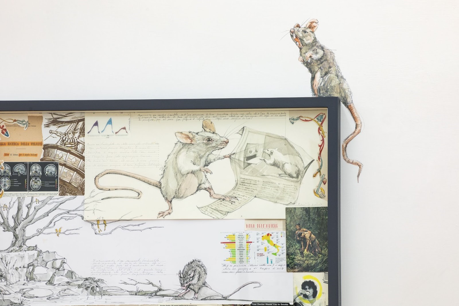 Le opere in mostra reinterpretano i sette capitoli in sette teche, dove il disegno, le frasi a matita e il collage di ritagli di giornale e riviste di un lavoro d’archivio post-funzionale sono in perfetto dialogo, stimolando il visitatore alla riflessione e alla presa di coscienza. Protagonista di questo racconto è il topo, animale allegorico che Tibaldi sceglie in quanto «Testimone costante delle dinamiche umane perché predilige il contesto urbano» esso però fugge dalla cornice per invadere lo spazio espositivo: «I topi fuori dalle teche sono una richiesta di relazione con la parte meno bella di noi, la parte che ci da un senso di repulsione e di possibile mancanza di pulizia».