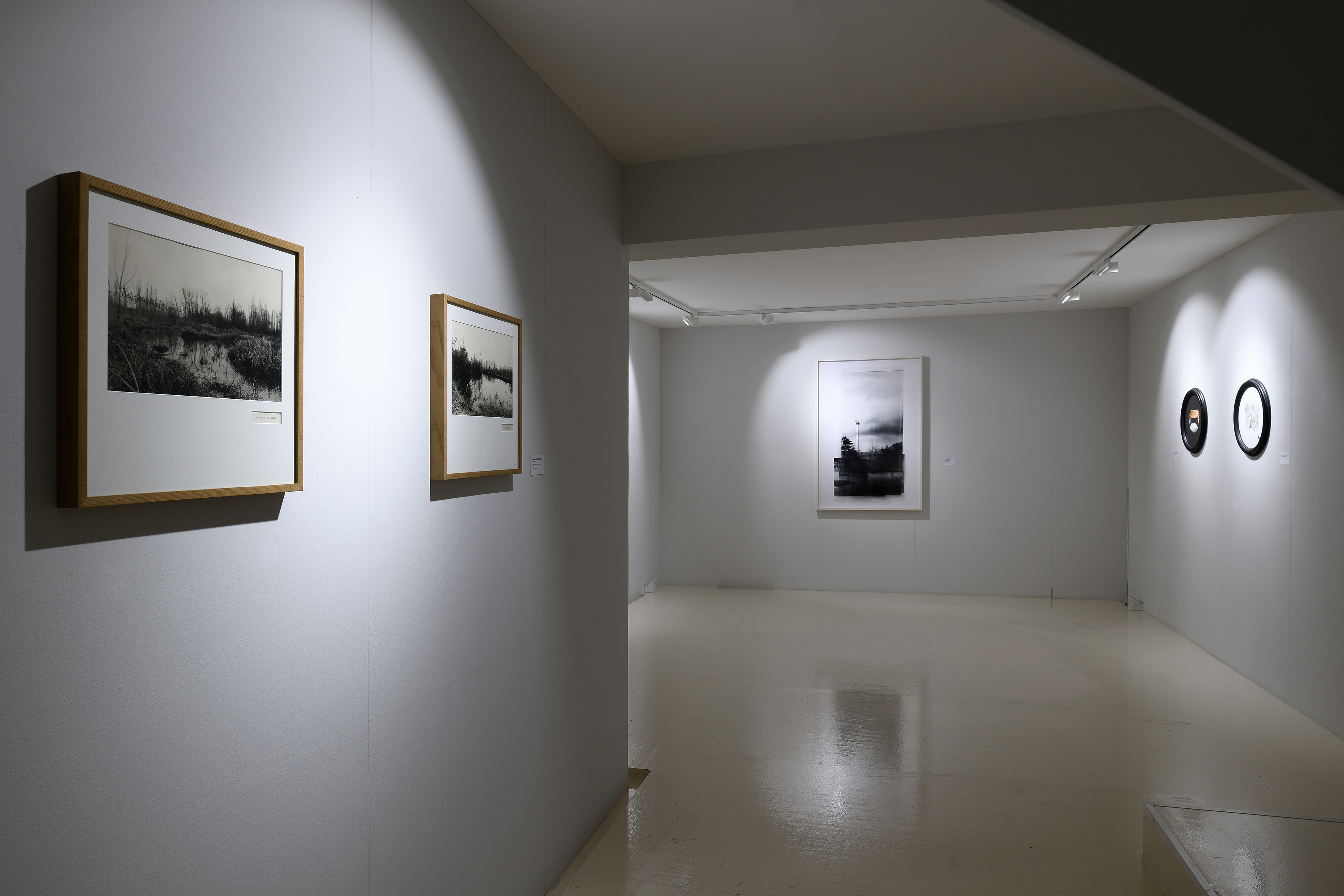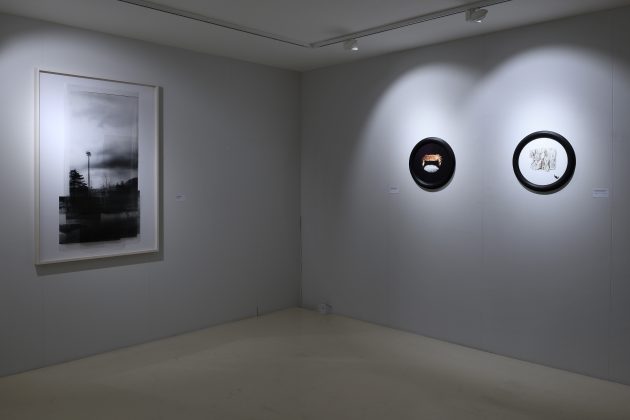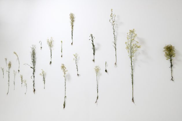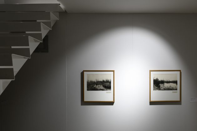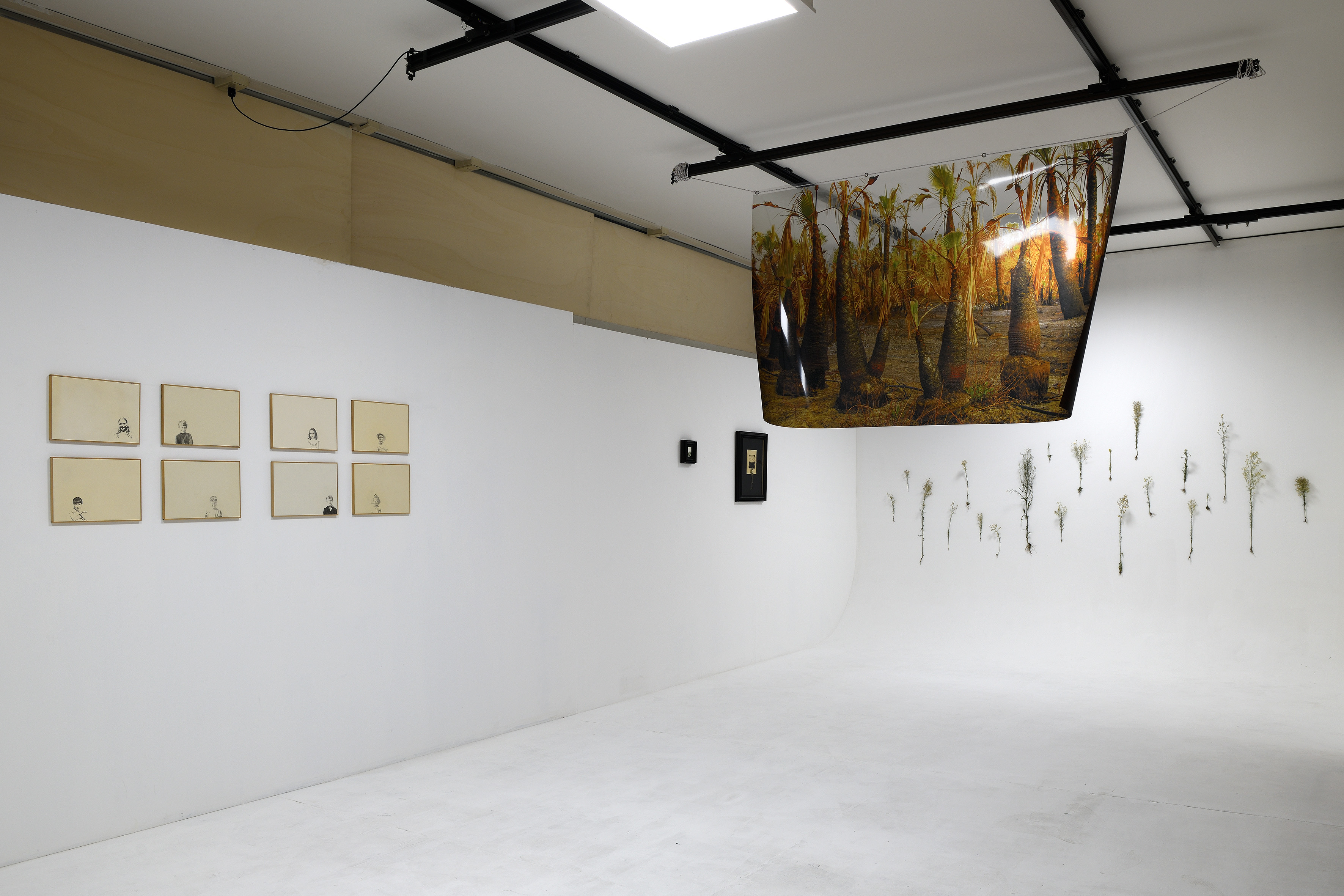 Dal soffitto cala una stampa fotografica su PVC: Catania Fuoco #01, di Patrizia Zelano. Lo scatto denuncia l’incendio che ha devastato la costa di Catania nel 2021, presentando tronchi di palma inceneriti nel primo piano di una scena quasi teatrale. A dialogare con questa foresta appesa c’è l’installazione di Luca Piovaccari, Sciogliere l’invisibile. Le piante diventano forza poetica che contamina sia i disegni incorniciati sia la parete. Rami di Conyza canadensis pendono nel vuoto, secchi e nudi fino alle radici. Con le sue piante infestanti, icone di resistenza, Piovaccari ci ricorda che «L’uomo lascia le proprie tracce ma la natura se ne riappropria in maniera subitanea».