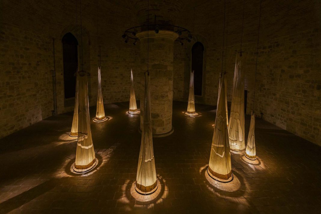 Antonio Marras lasciandosi suggestionare dall’intera struttura dell’edificio, lo ha reinterpretato nella sua totalità come luogo di ombre, intese come memorie simboliche e fisiche, presenze che legano la figura di Cecco d’Ascoli alla vita reclusa dei prigionieri del carcere, che proiettavano desideri, speranze, ricordi e memorie nei diversi ambienti, dalle celle al cortile, fino allo spazio monumentale della chiesa della Madonna del Lago, ideale punto di arrivo del percorso immaginato da Marras.