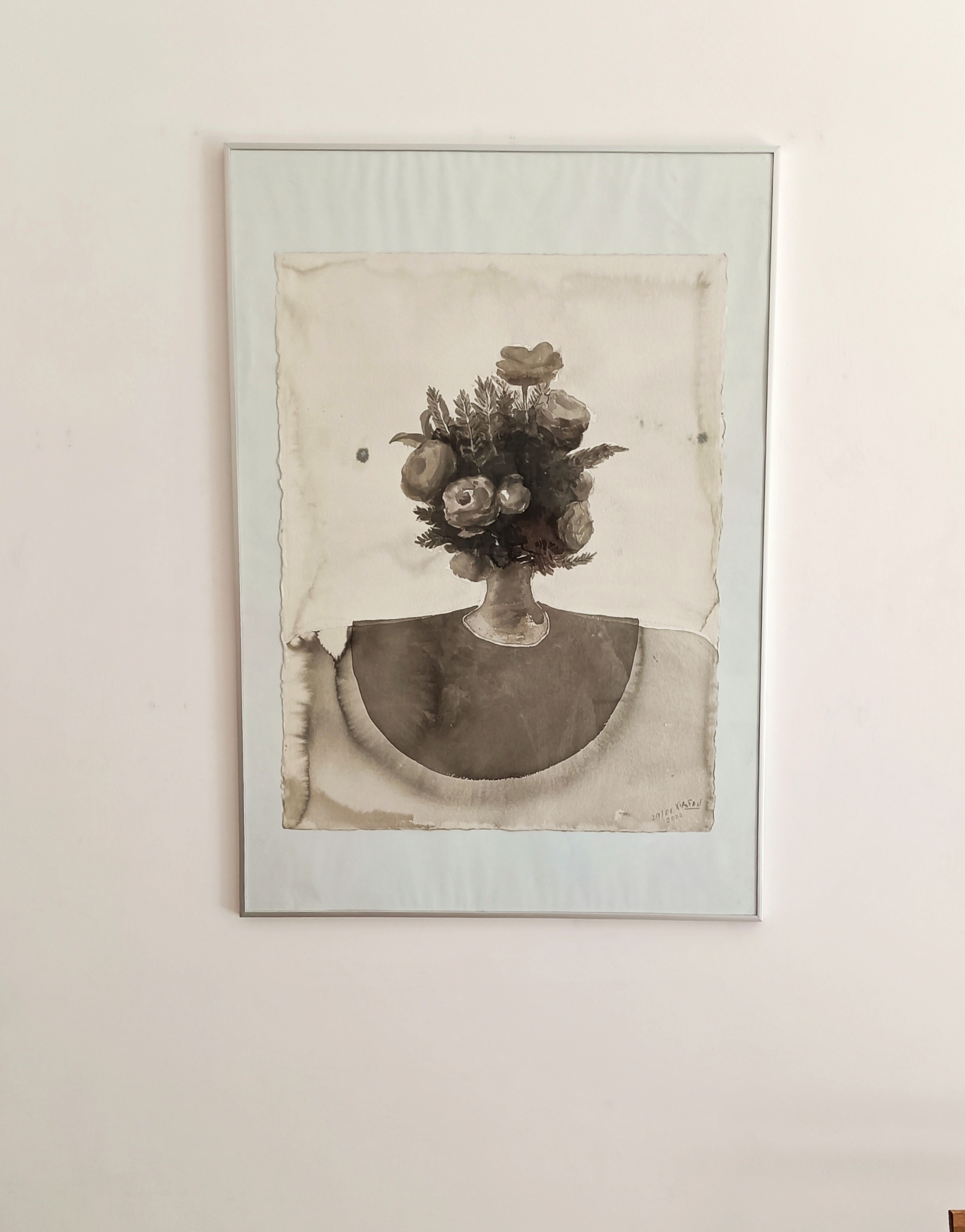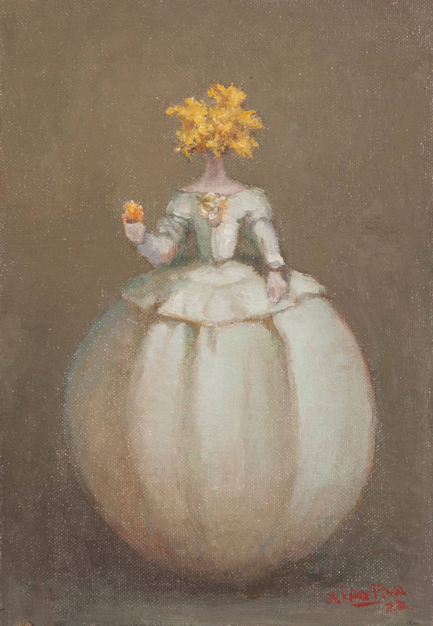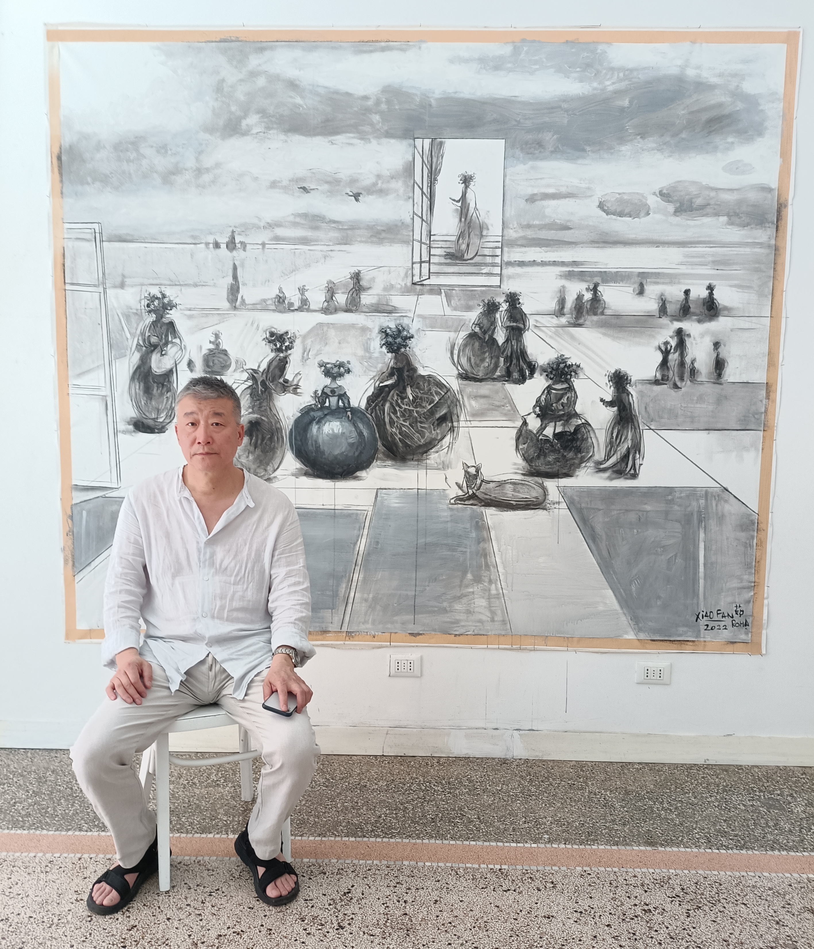In particolare chiaro è il riferimento e omaggio alla reinterpretazione realizzata da Dalì al lavoro di Velasquez nel 1977 in cui l’opera di Velasquez era inserita all’interno di una porta nel cielo. Ru Xiao Fan rende sempre i suoi lavori parte di un tutto in cui non c’è distinzione tra chi è venuto prima di noi e chi verrà dopo: il nostro vivere nutre, anche con le sue infinite debolezze, il futuro; non c’è invenzione assoluta né discontinuità, si può solo procedere…oltre. In questo modo non ha senso ripetersi e un’opera e uno stile artistico vivono di nuovi sensi con nuove tecniche al cambiare del tempo. I fiori sempre presenti nelle opere dell’artista cinese sono oggi ritratti senza colore. Erano nati invece nei primi anni 2000 come inno alla libertà di parola e facevano riferimento alla repressione culturale cinese di Mao (“Campagna dei 100 fiori” del 1957). Oggi come spiega l’artista facendo riferimento al buddismo “sarebbe meglio tagliare i fiori che abbiamo in testa, perché abbiamo troppi pensieri”».
