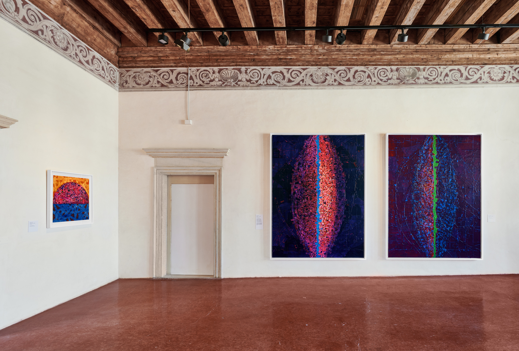 Nelle ampie sale del Museo di Palazzo Grimani (raro esempio di architettura rinascimentale tosco-romana a Venezia), prendono spazio e si sviluppano mappature astratte dai colori caldi e lucenti: tele fitte di reticolati che intessono geometrie uniche.
