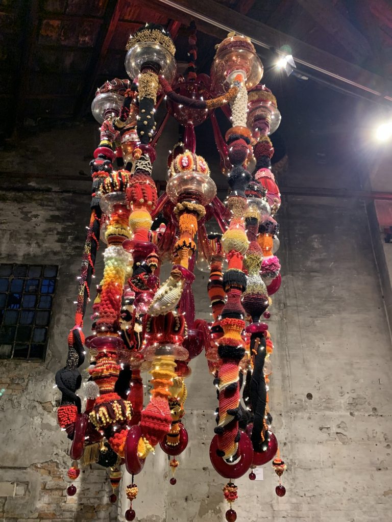 Colmo di fascino e di calda atmosfera, l’ambiente dell’antica fornace accoglie il colossale lampadario di Joana Vasconcelos, dove il vetro si nasconde negli intrecci del tricot, interamente lavorato a mano e dai colori sgargianti, rendendo l’oggetto artistico un audace capolavoro di tecnica e stabilità. Il Vegetables Falling From The Sky Chandelier, di Laure Prouvost, è un pezzo di design spiritoso e accattivante, nella resa delle verdure stilizzate alla Cartoon, illuminate dall’interno.