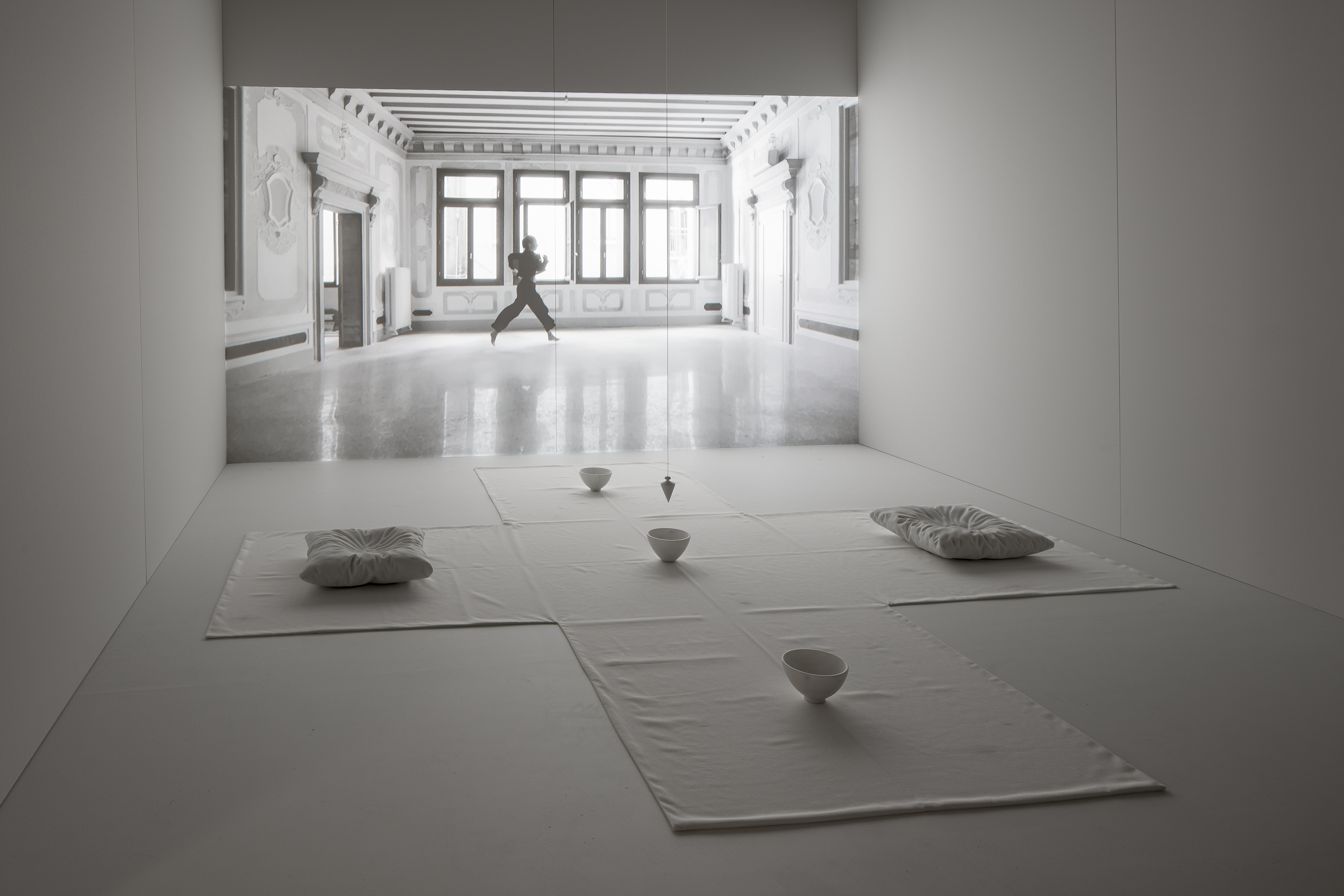 Il vetro è un materiale che spesso ritroviamo nelle opere di Silvano Rubino. Per la Venice Glass Week il dialogo è proprio creato dall’accostamento di questo materiale agli altri, tutti tasselli di uno stesso universo creativo in cui si cerca un nesso, un collegamento che crei equilibrio tra istanze diverse, nel tentativo di avvicinare l’osservatore ad una percezione del mondo che tocchi la sofferenza stessa dell’artista per le infinite afflizioni che attraversano l’essere umano. Se questo aspetto così profondamente terreno emerge con chiarezza quasi violenta nella scrittura, nell’opera visiva assume i connotati di una meditativa compostezza. Questo il caso dell’installazione Bianco nel bianco. Hansel e Gretel, White traces in search of yourself, una stanza di telai da pittura a cui si accede attraverso uno stretto corridoio a spirale, all’interno della quale due cuscini in marmo, tre ciotole e un pendolo simmetricamente posizionati sono punti di equilibrio di un video in cui una donna corre a rallentatore da una porta all’altra di Palazzo Bonvicini, per poi non trovare via di fuga e cadere.