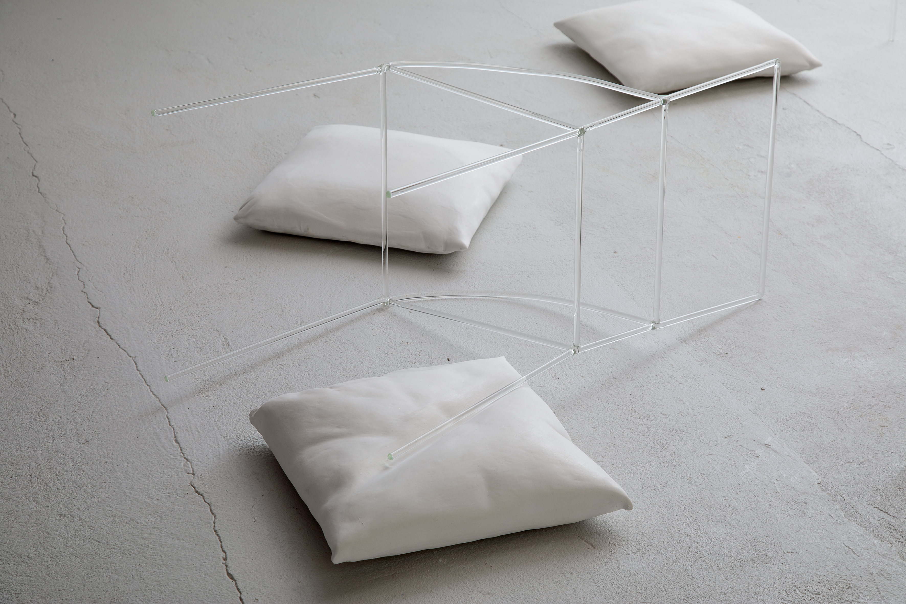 Sedie di vetro esposte in circolo, un po’ in piedi un po’ cadute, su cuscini perfettamente posizionati riportano alla lotta eterna tra ordine e caos, mentre un libretto rosso originale di Mao Zedong viene esposto sotto una campana di vetro contornata da due ciotole di sale, tentativo di conservazione destrutturata dell’icona comunista.