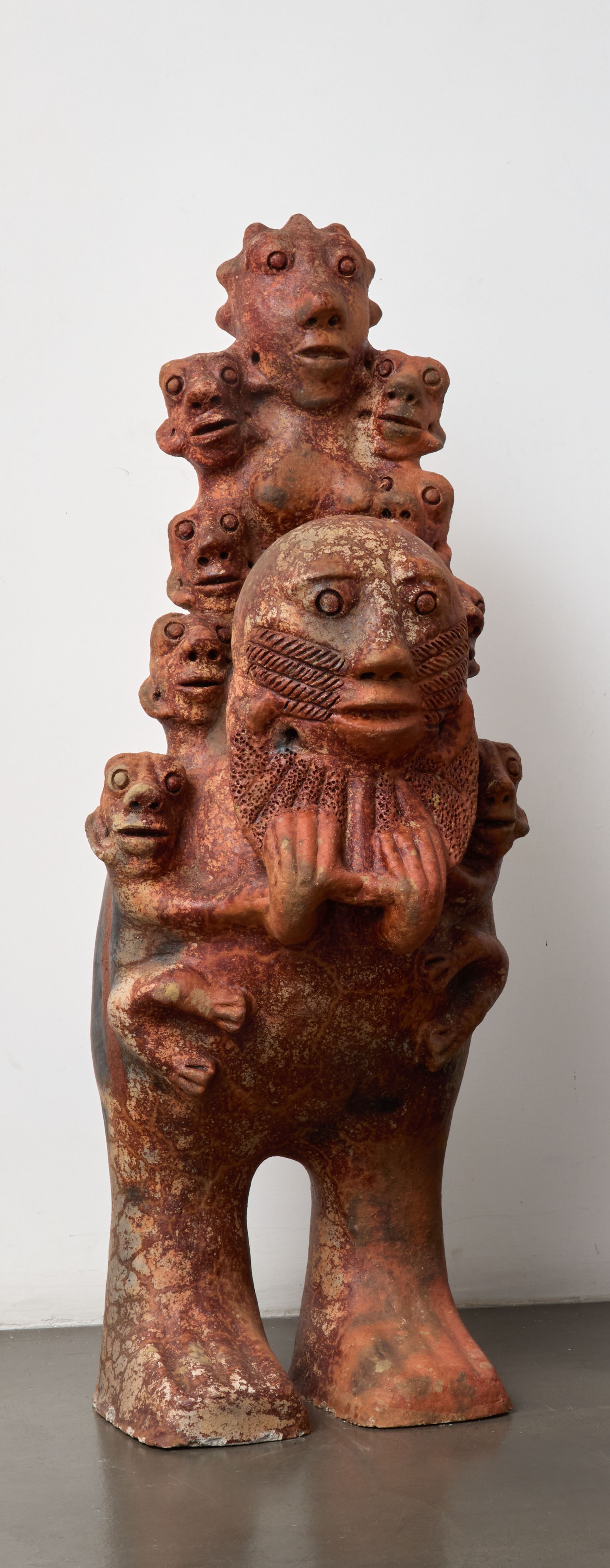 Seyni Awa Camara è originaria del popolo Diola e le sue sculture in terracotta mantengono un forte legame con la tradizione. Connaturata all’animismo, l’artista attinge alle pratiche artigiane della sua comunità per rappresentare il suo mondo interiore. Densa di immagini ancestrali cui sottrae la loro aderenza temporale, dà luogo a un’estetica magico-simbolica, citazionista e sardonica, del repertorio figurativo e allegorico del sacro, creando per esso delle discrepanze con le sue origini: volti incisi e abbrutiti, un corpo centrale a dare origine ai suoi molteplici, e un colore ferruginoso che si avvicina più alla terra che al cielo.