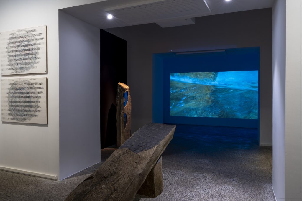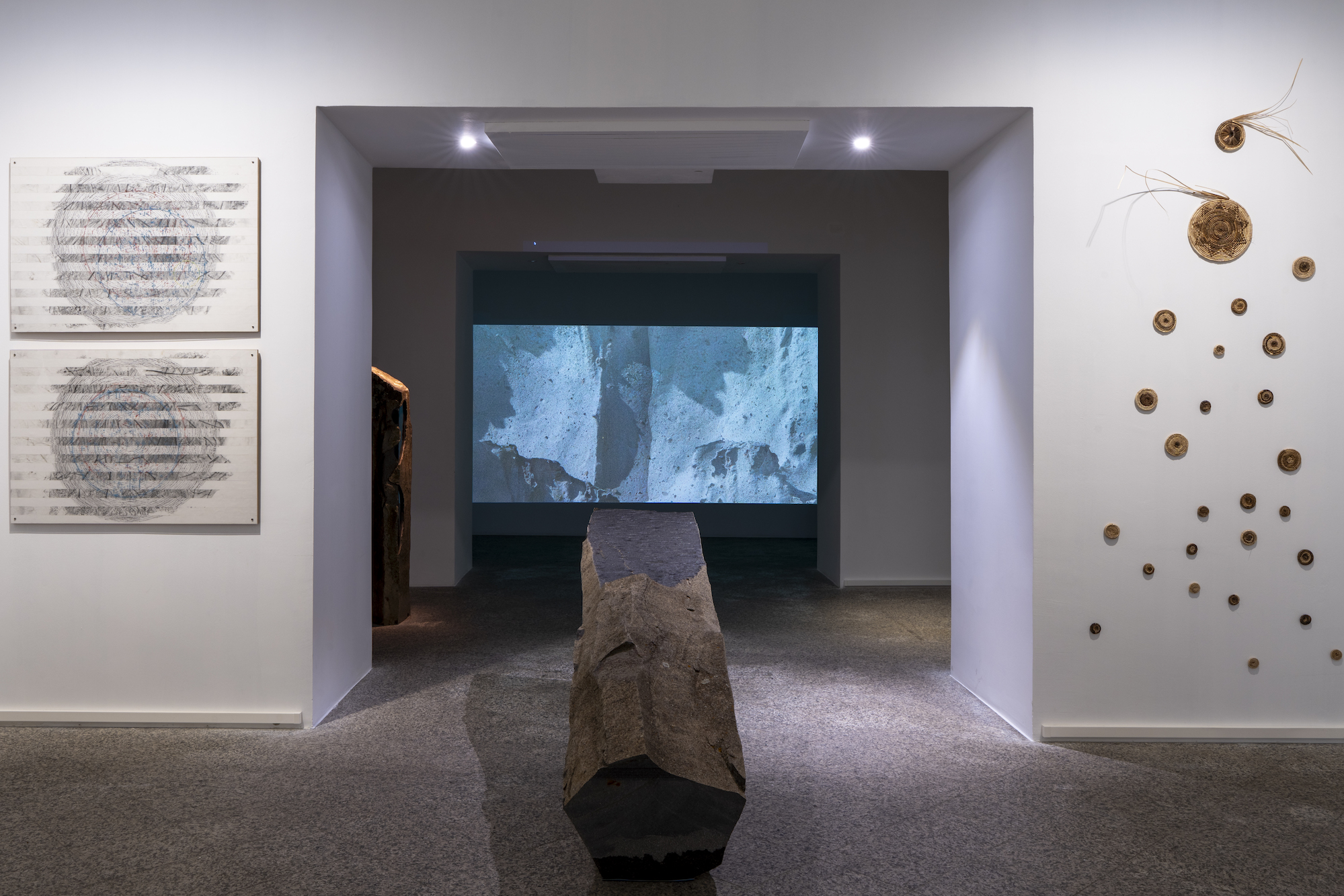 ISCRA esplora con grande attenzione questa regione nord-occidentale della Sardegna e ne coglie le caratterizzazioni naturali, le trasformazioni urbane ed economiche, e le storiche lavorazioni artigianali. Nel primo ambiente, il collettivo Check Point Charlie raccoglie tracce sulle strade e sui sentieri della Planargia, con un interessante lavoro di ricerca in negativo sulla ferrovia Bosa-Macomer. Sulla destra, Maria Antonietta Sechi, con Costellazioni, esplora la lavorazione dell’asfodelo, pianta che storicamente veniva intrecciata per la produzione di cesti e manufatti d’uso quotidiano, oltre a dare un miele aromatico e amaro, tipico della tradizione sarda. Qui l’asfodelo diventa una costellazione, meridiana guida ideale per i movimenti all’interno della mostra. Nell’ambiente centrale, gli allievi e i docenti del Dipartimento Arti visive dell’Accademia di Belle Arti “Mario Sironi” incidono «impronte, passi, nuove transumanze» sulla pietra, evocando memorie storiche rimaste imperiture nel tempo e ridando voce a un passato che ancora pulsa sotto la superficie.